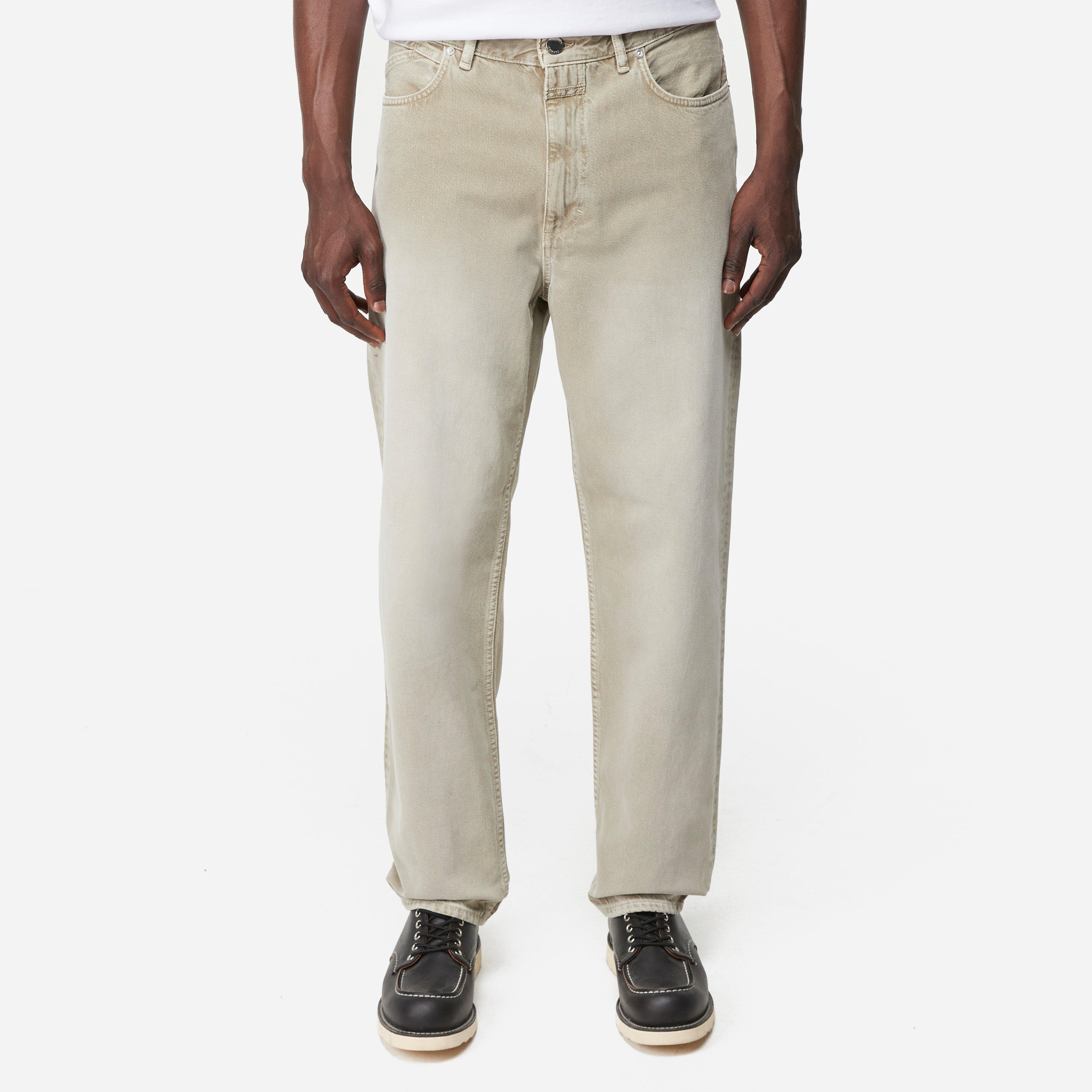 Beige - 79% cotton, 20% recycled cotton, 1% elastane - 12 oz - 5 pocket style - Mid rise waist - Straight leg - Model is 6'2" and wears size 32".