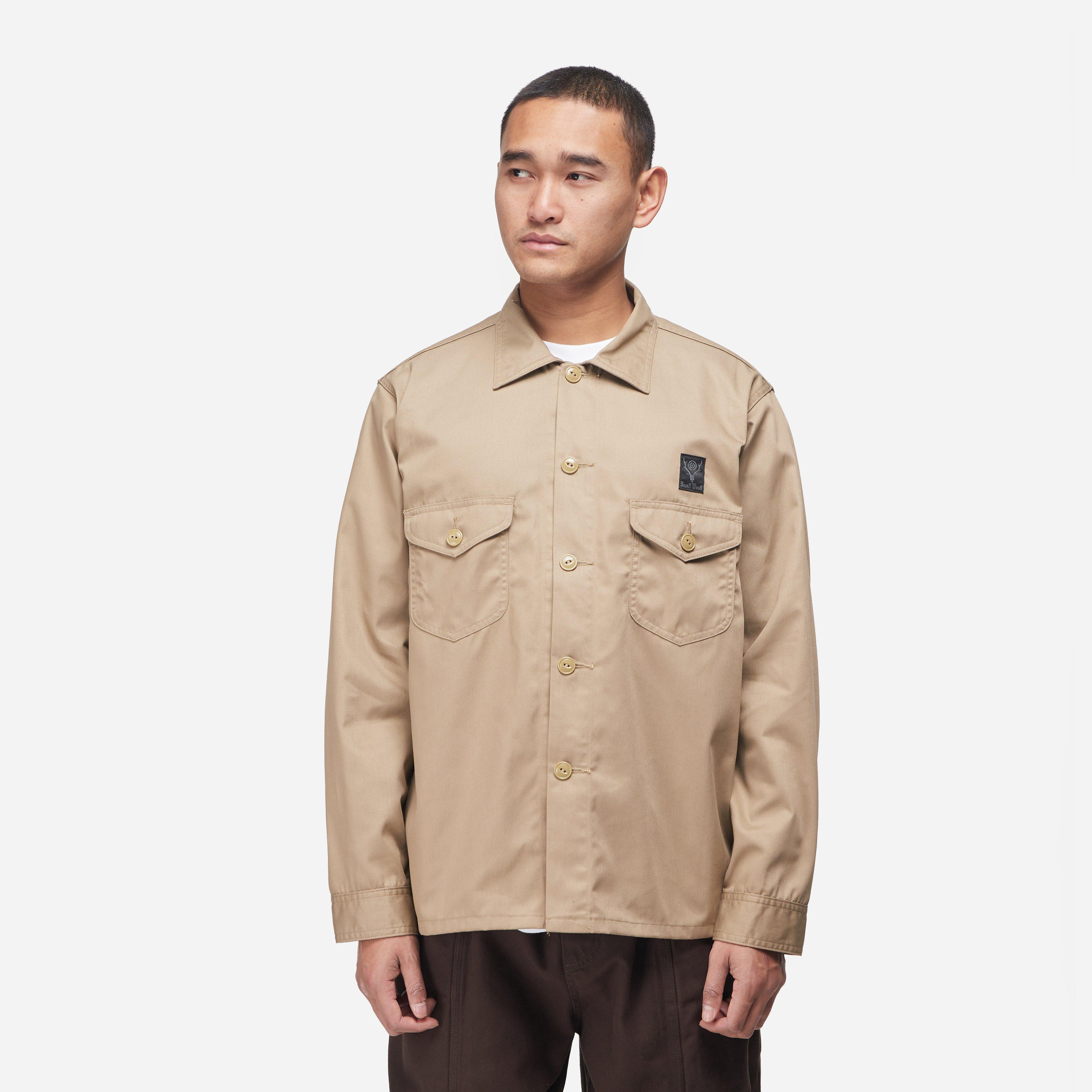 The fabric is firm with a slight sheen, decorated with traditional cat-eye buttons. Beige - 65% polyester, 35% cotton - Cat-eye button closure - Button cuffs - Flap chest pockets - Woven logo patch - Made in Japan - Regular fit take your normal size - Model is 6'0" and wears a medium.