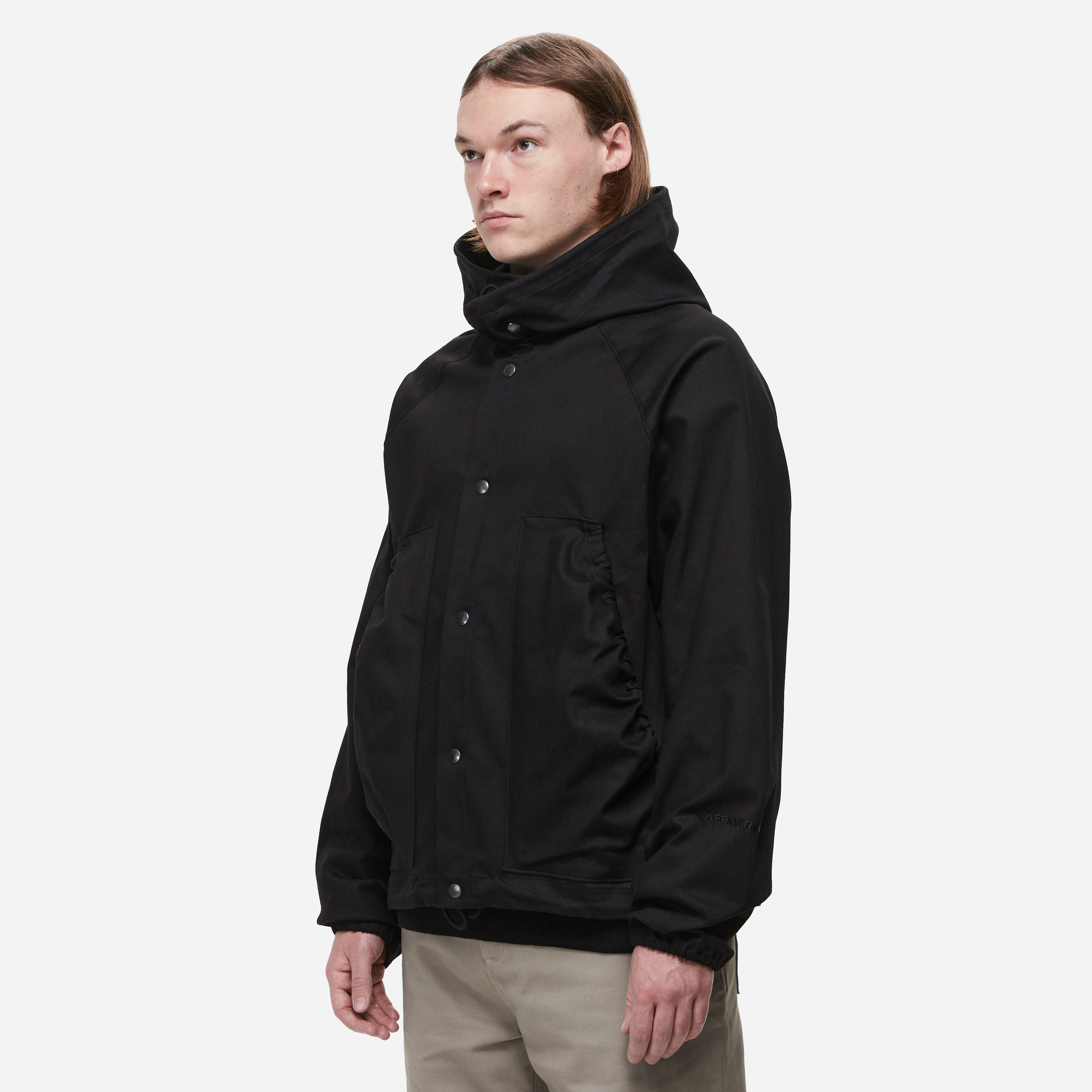 AFFXWRKS AW24 references underground New York radio station and cultural space DUST. Housed in an old warehouse before it turned into a residential tower, DUST housed shows and happenings bringing together New York's emerging electronic DIY scene. Black - 74% cotton, 22% recycled post-consumer polyester, 4% elastane - Oversized fit - Two way stretch - Unlined - Extended snap hood - Snap closure - Elastic toggle hem and hood - Made in Portugal.