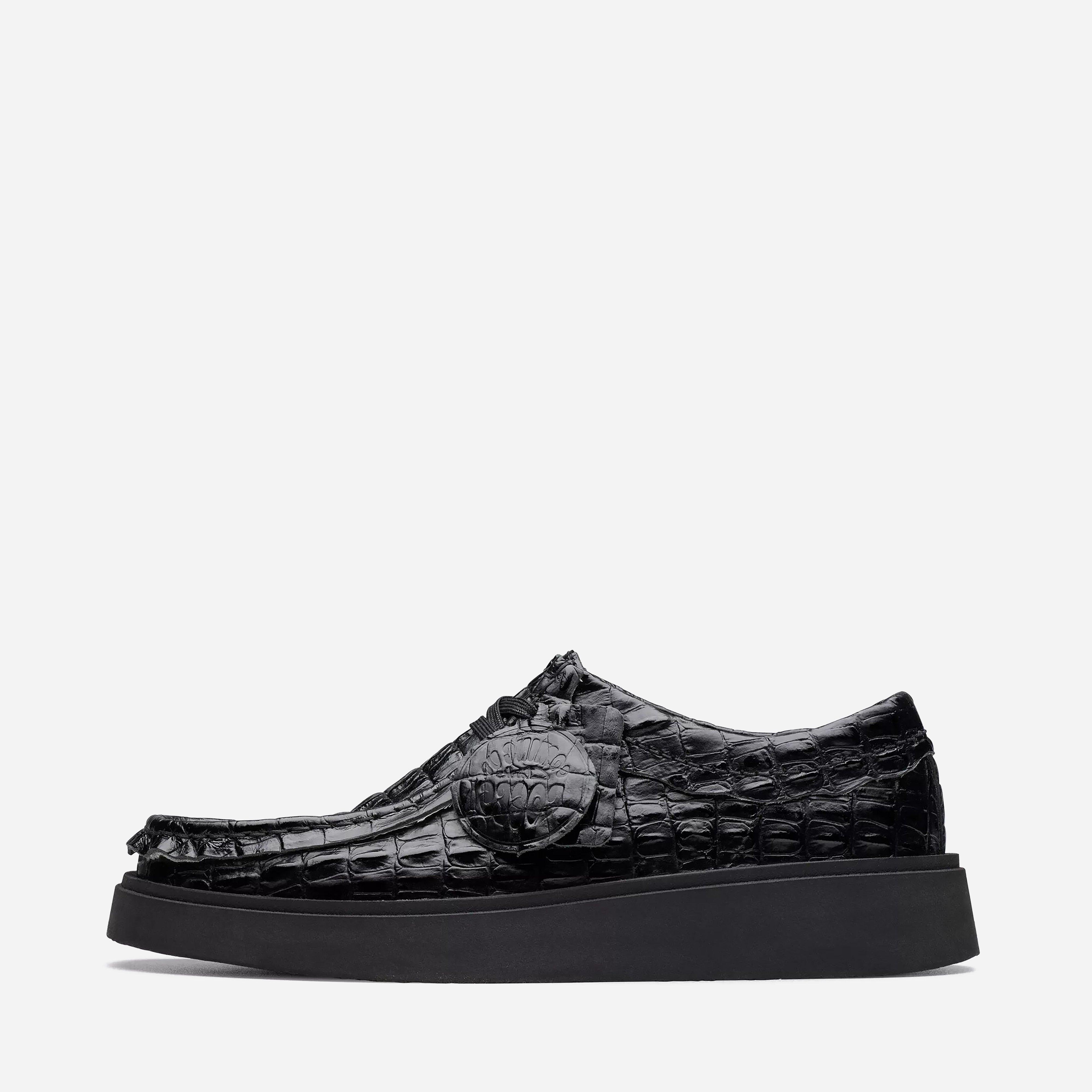It combines considerate detailing like intricate stitching and premium materials including embossed croc-like leather uppers designed by creative director Martine Rose. Black - Leather upper, TPR rubber sole - Part-recycled Contour Cushion footbed - Debossed fobs - Style code: 26183331
