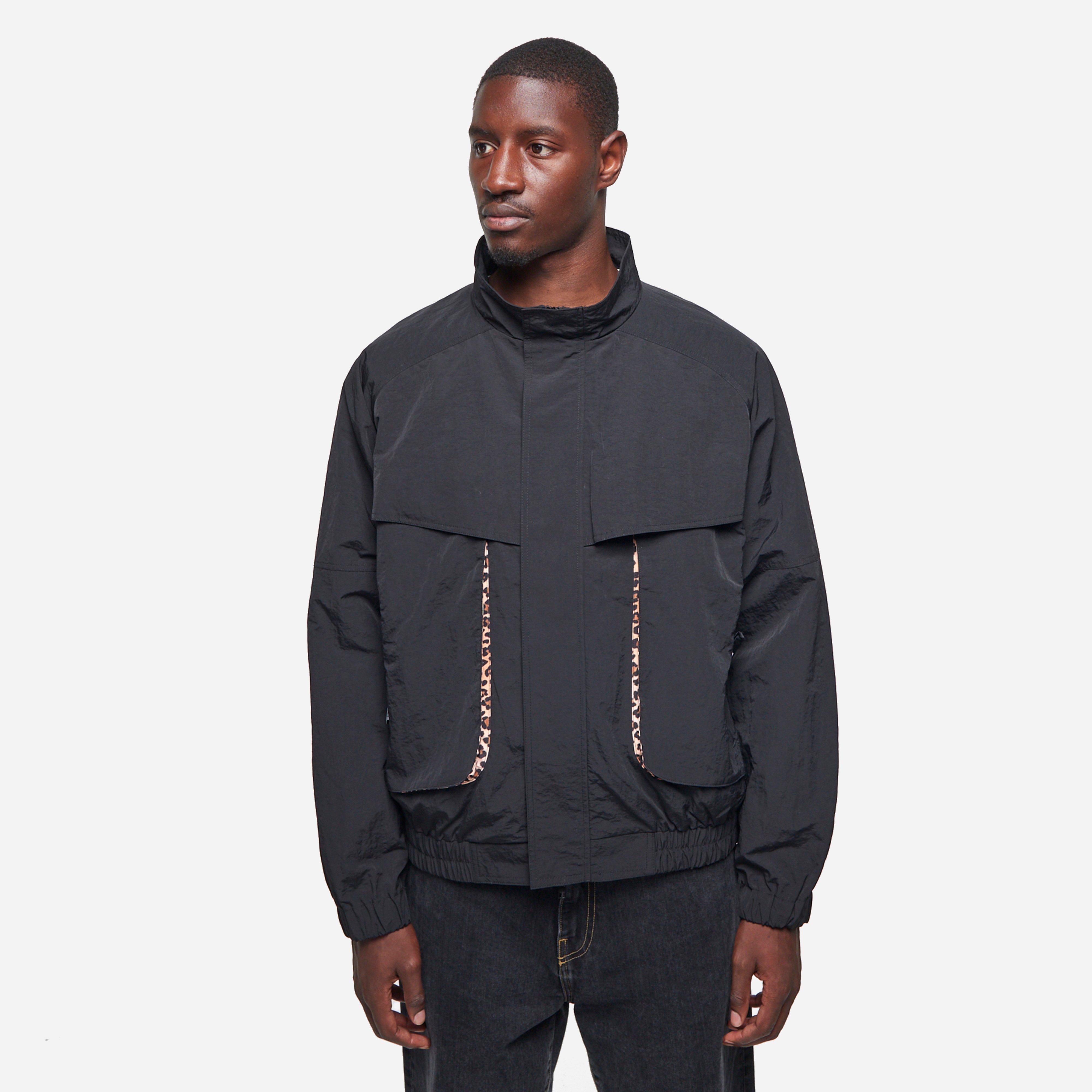 Black – 100% polyester – Oversized fit – Crinkled texture – Leopard print trims – Zipped pockets – Elasticated hem and cuffs – Model is 6’1’’ and wears a size medium.