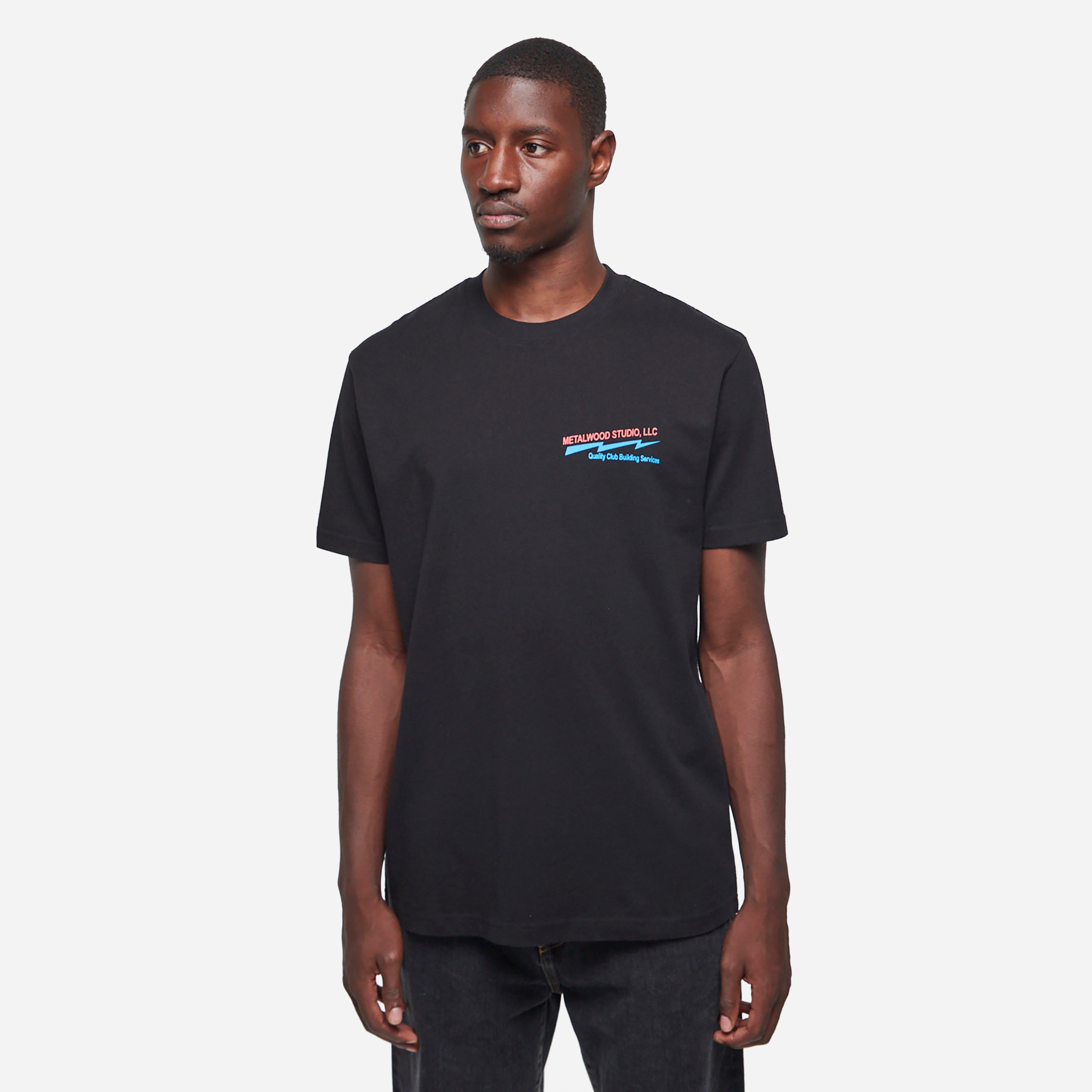 Black – 100% cotton – Traditional fit – Rib collar – Screen prints – Model is 6’1’’ and wears a size medium.