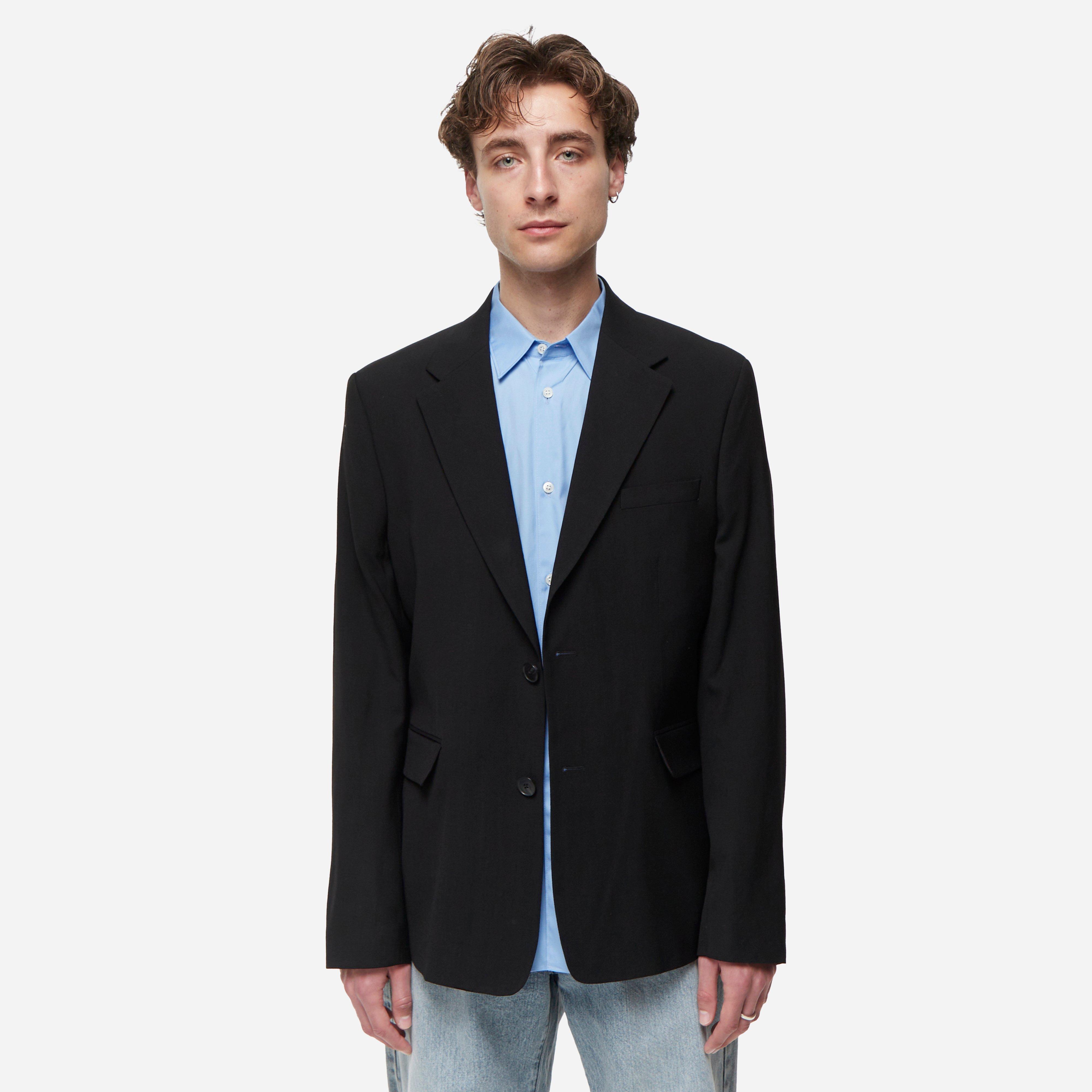 Black – 100% wool – Notched lapel – Recycled polyester satin lining – Two button closure – Welt chest pocket – Two flap pockets – Back hem vent – Padded shoulders – Model is 5’11’’ and wears a size medium.