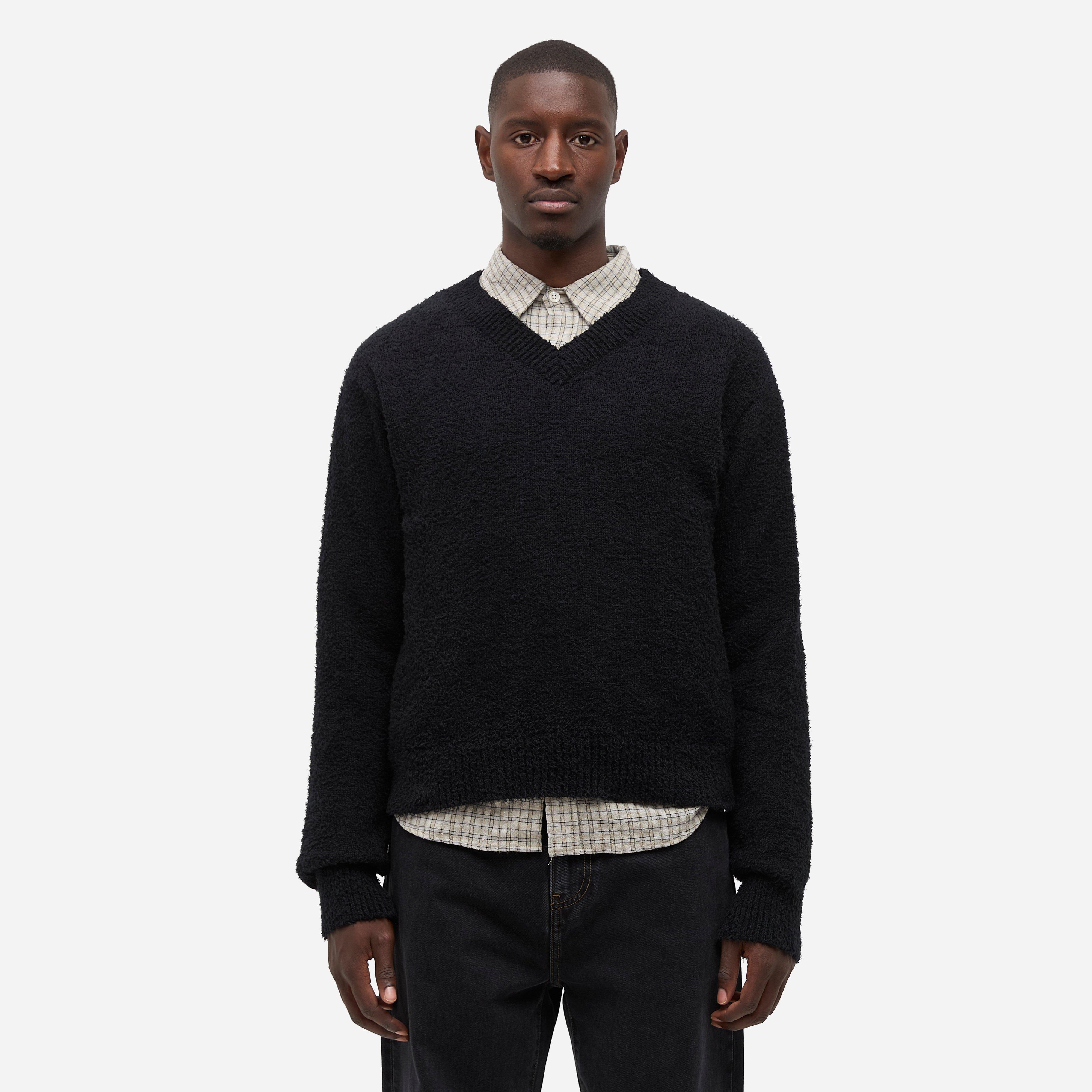 Black – 100% organic cotton – Relaxed fit – Dropped shoulders – Knit construction – Fuzzy texture – 1x1 rib trims – Yarn made in Italy – Model is 6’1’’ and wears a size medium.
