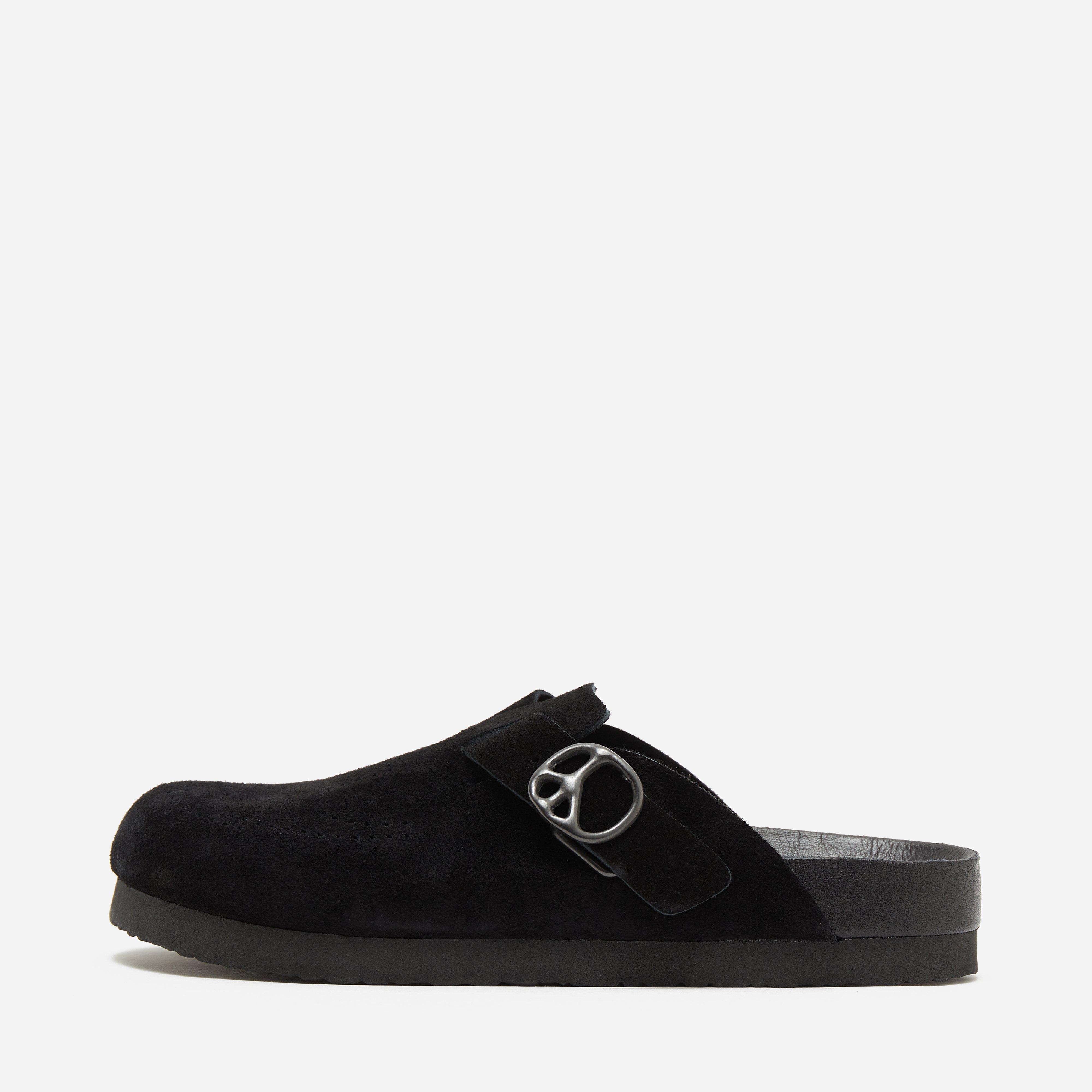 Black - Suede upper, rubber outsole - Punch hole pattern - Adjustable strap - Peace buckle applique - Regular fit, take your normal size.