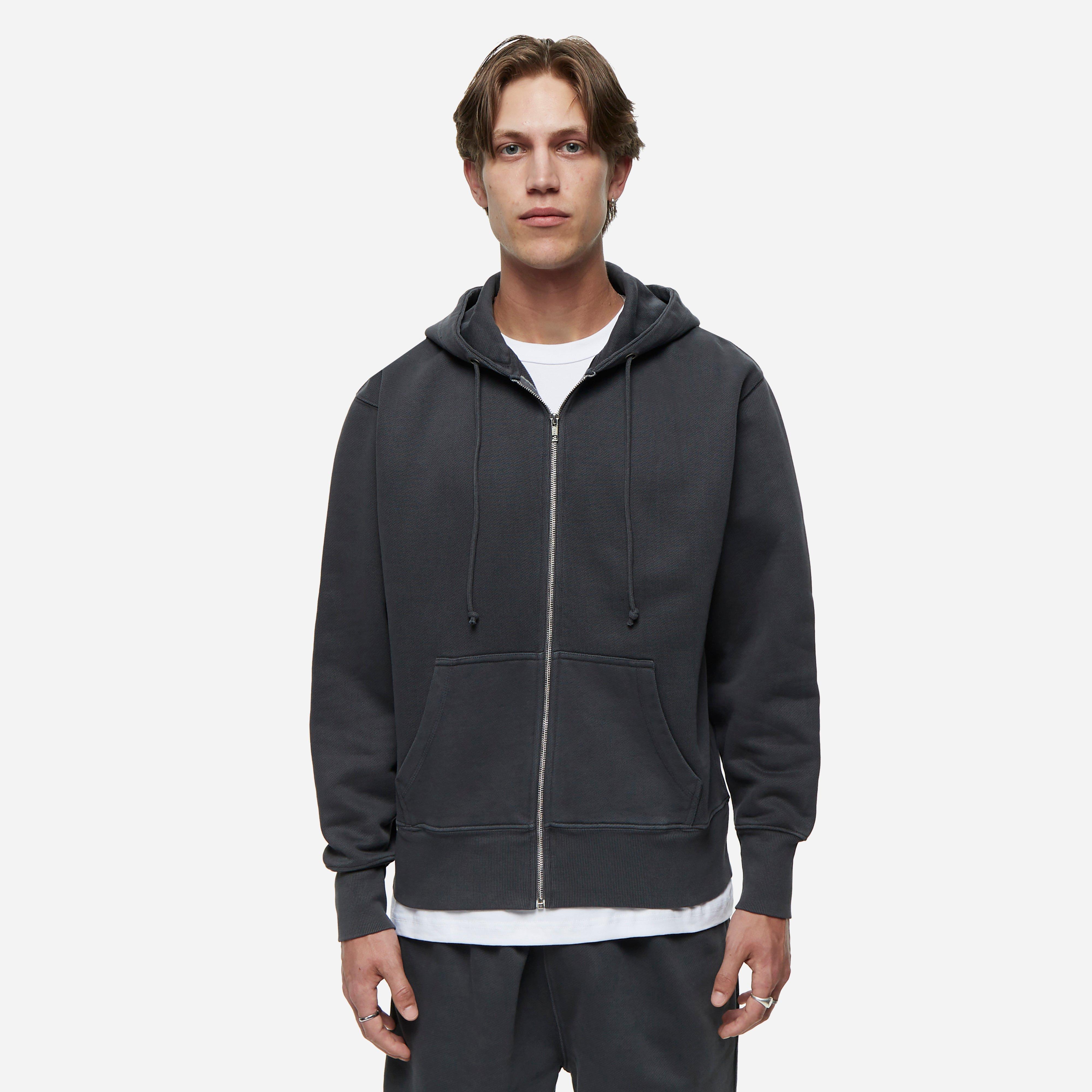 Black - 14oz GOTS organic cotton - 450gsm - Front zip - Drawstring hood - Ribbed cuffs & hem - Model is 6'2.5" and wears a size medium