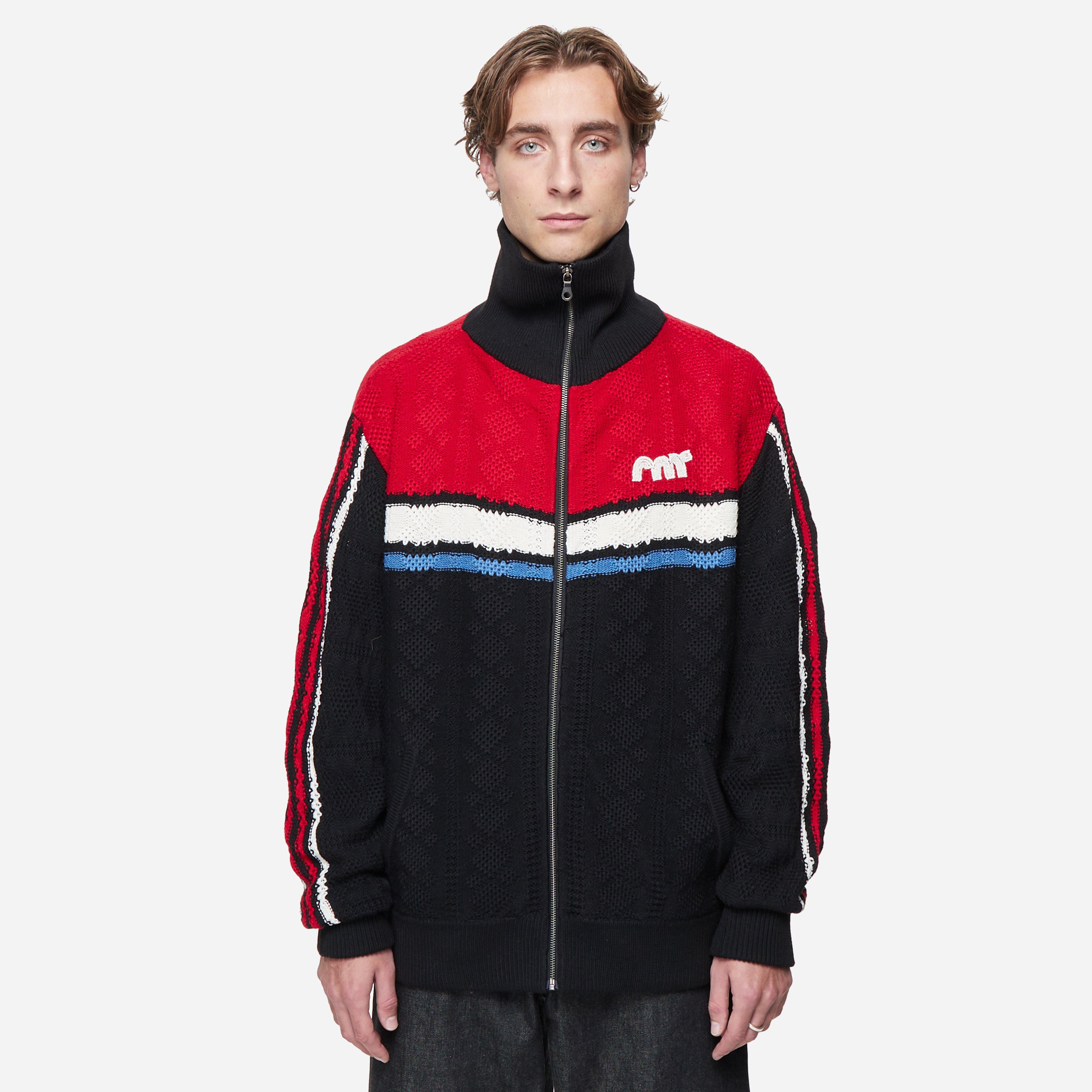Black – 40% polyester/20% wool/20% acrylic/20% nylon – High collar – Full zip closure – Jacquard logo and stripes – Patch pockets – Ribbed trims – Model is 5’1’’ and wears a size medium.