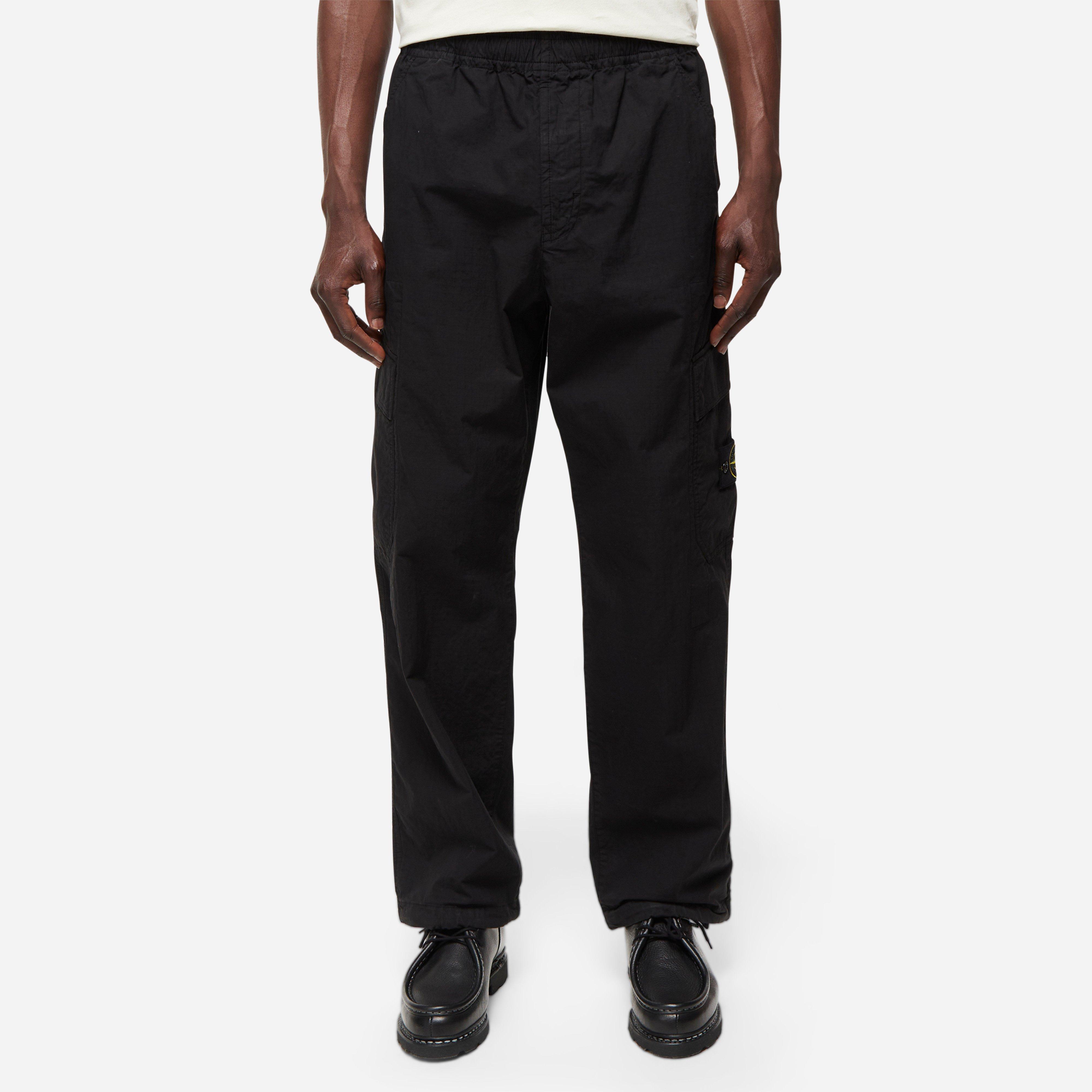 The RipStop Cargo Pant are crafted from organic cotton of military origin with custom Stone Island checkering. Black - 95% Cotton, 5% Elastane - Made in Indonesia - Garment dyed - Slanted hand pockets - Zip fly - Loose fit - Elastic waist - Drawstring cuffs - Stone Island badge - Model is 6'2" and wears size medium