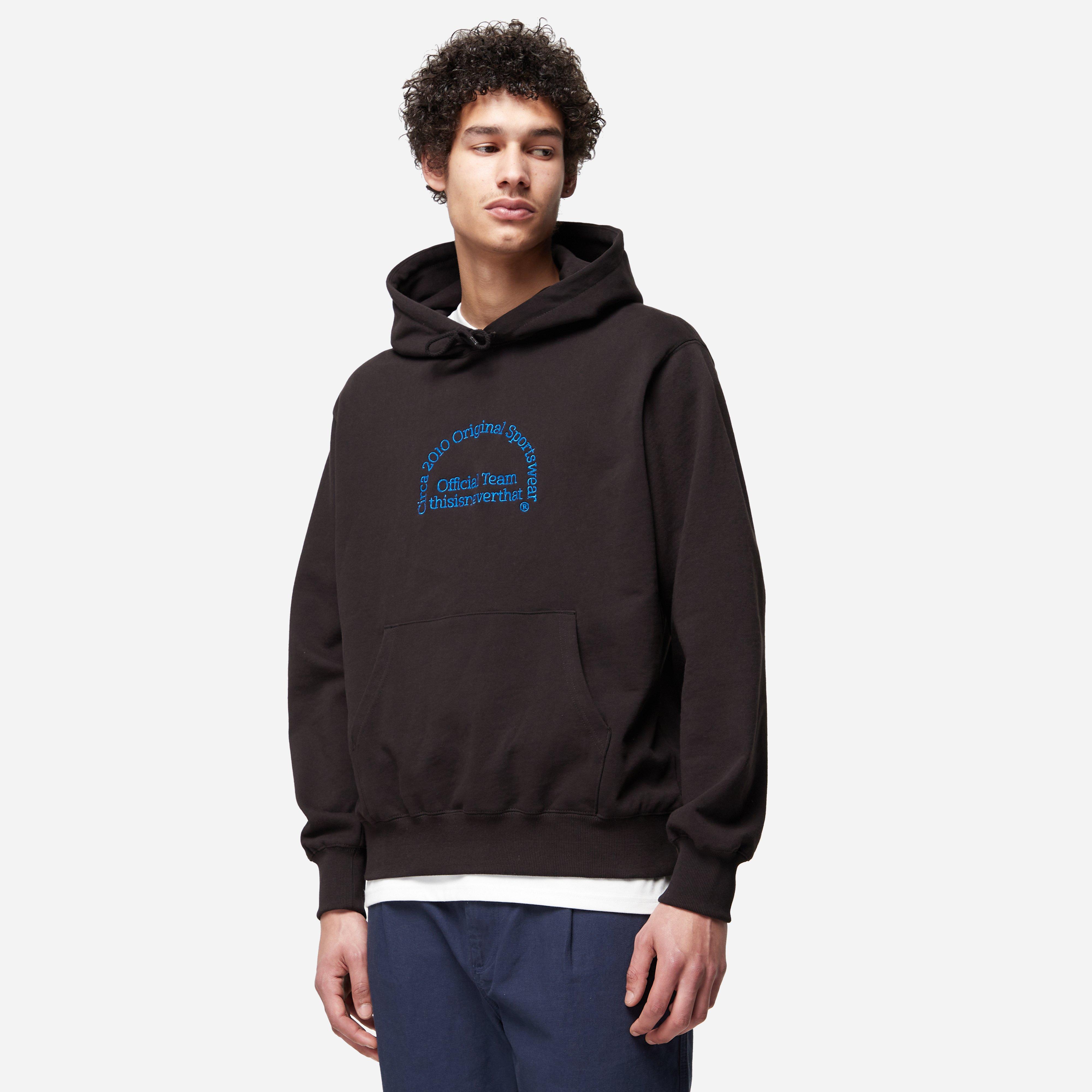 Black - 65% cotton, 35% polyester - Ribbed trims - Kangaroo pocket - Drawstring hood - Embroidered branding - Regular fit - Model is 6'1" and wears a size medium.