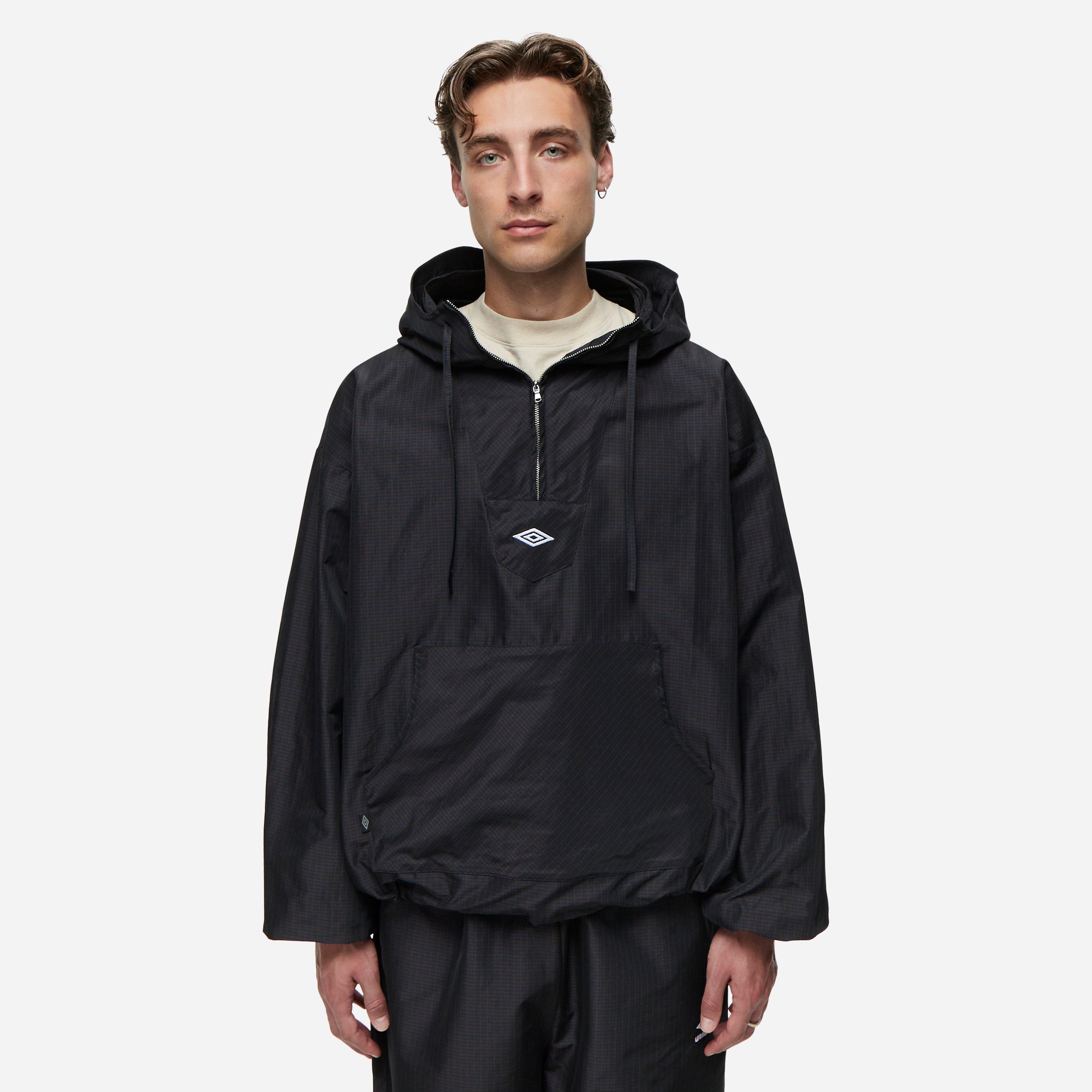 Black – 100% polyester – Boxy fit – Drawstring hood – Integrated mask – Weather resistant fabric – Kangaroo pocket – Elasticated cuffs – Half zip closure – Diamond embroidery – Model is 5’11’’ and wears a size medium.