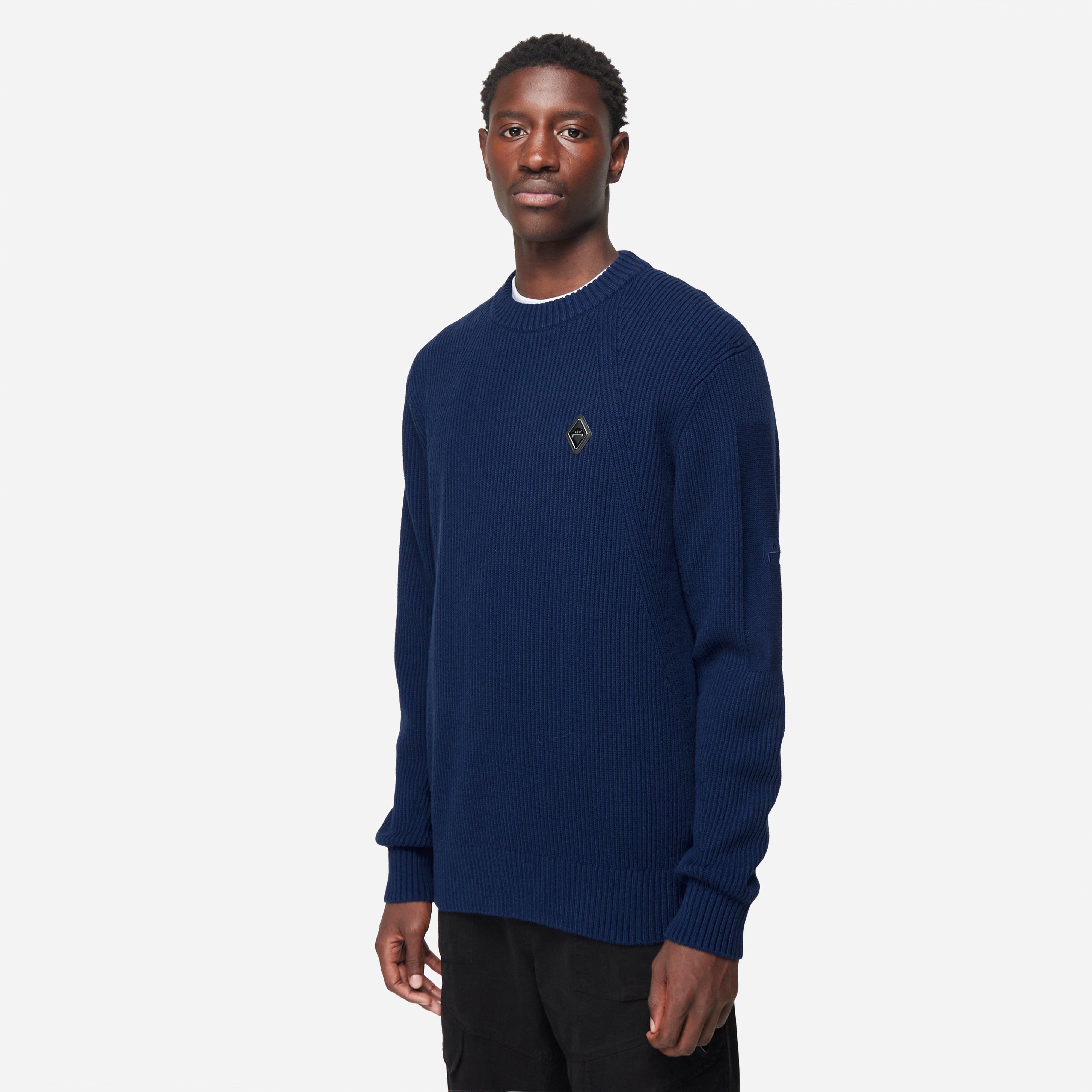 Blue - 56% cotton, 37% acrylic, 7% nylon - Fully fashioned construction - Ribbed trims - Enamel rhombus badge - External linking detail at seams - Plain knit insert at neck and purl stitch panel at sleeve - Embroidered branding - Relaxed fit, take your normal size - Model is 6'1" and wears a size medium.