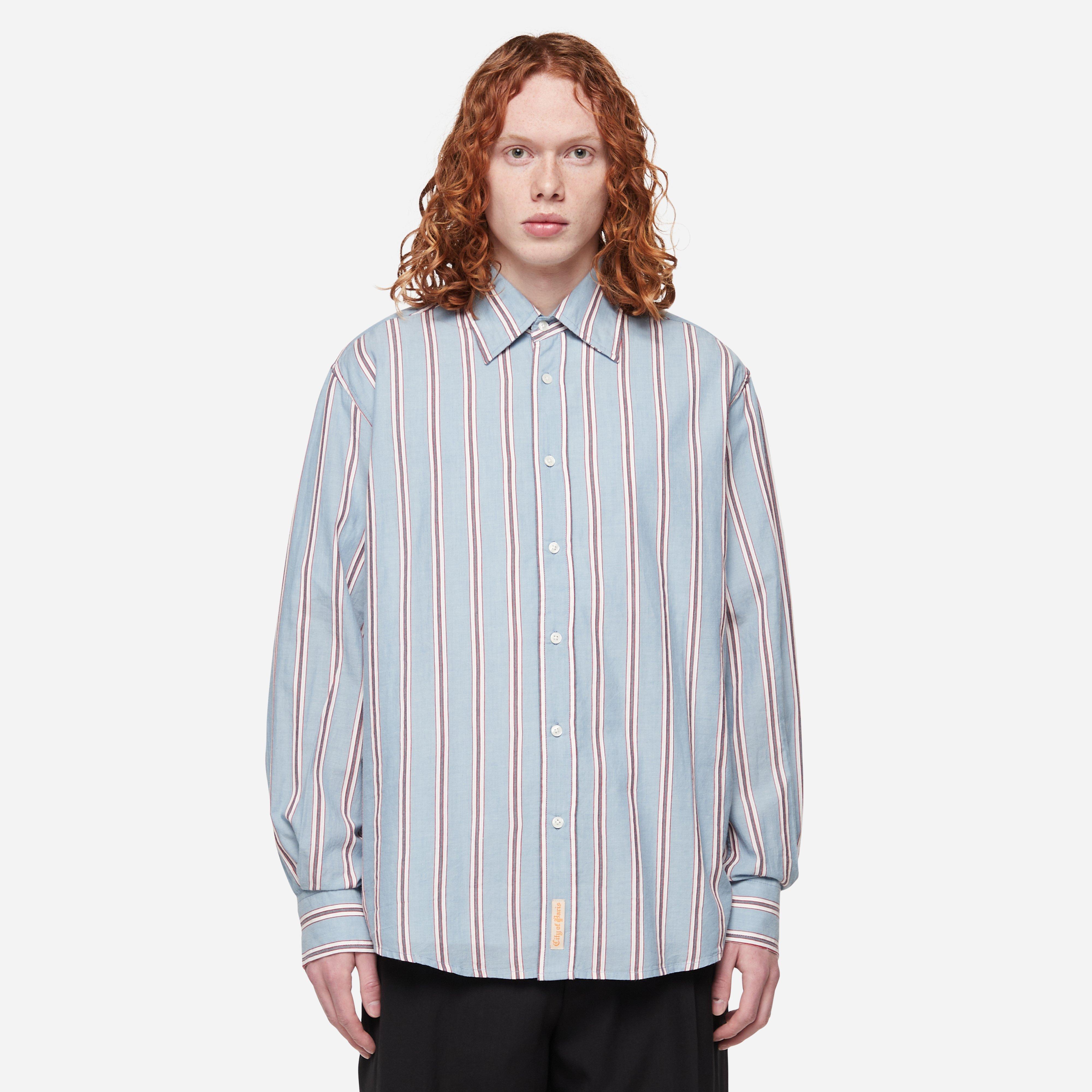 The Regatta Stripe Shirt is informed by vintage 1930s shirting samples. Blue – 100% cotton – Made in India – Antique ‘City of Paris’ label detail – Model is 6’1’’ and wears a size medium.