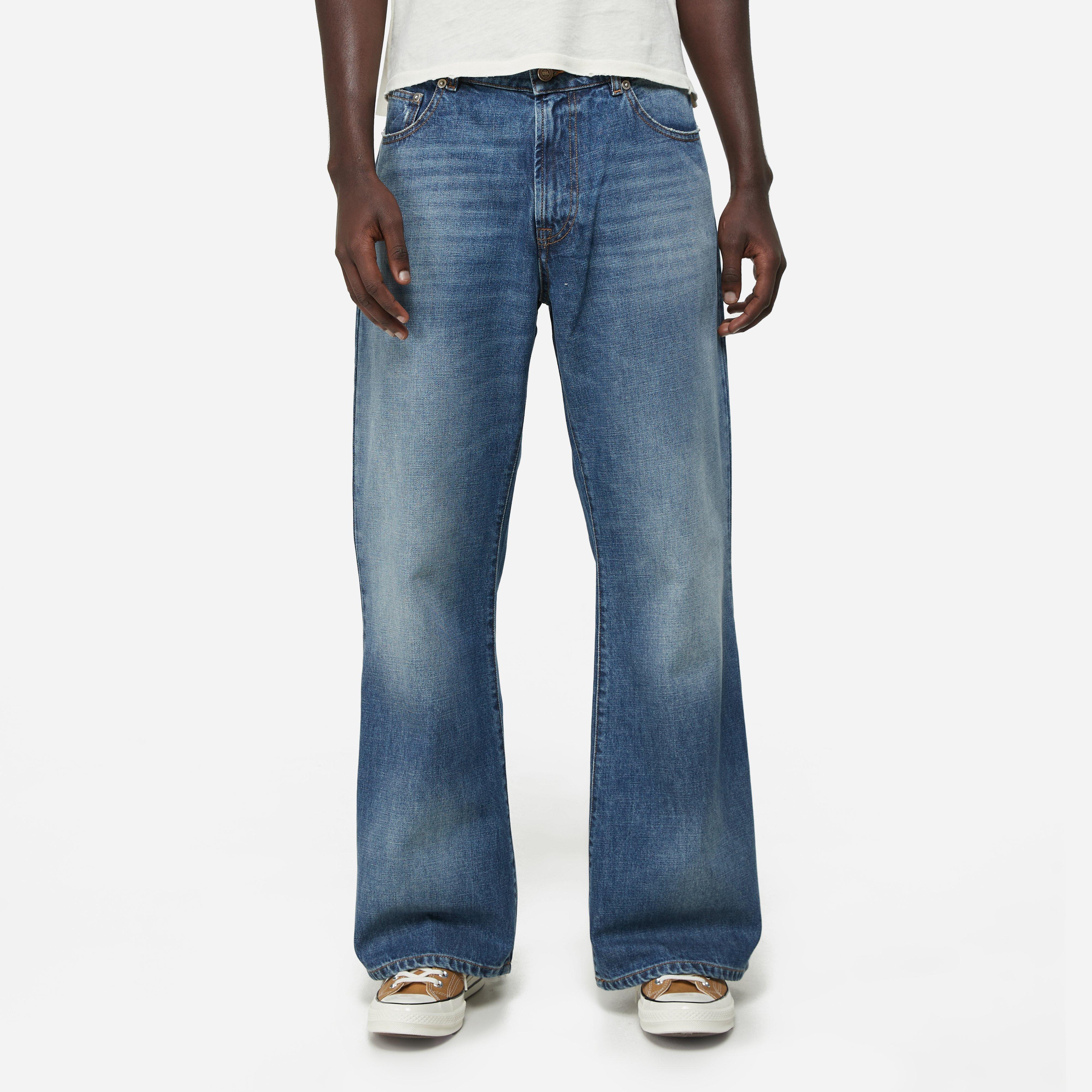 Blue – 100% cotton – Regular fit – Made in Tunisia – 5 pocket design – Belt loops – Distressed cuffs – Leather backpatch – Logo engraved hardware – Model is 6’2’’ and wears a size medium.