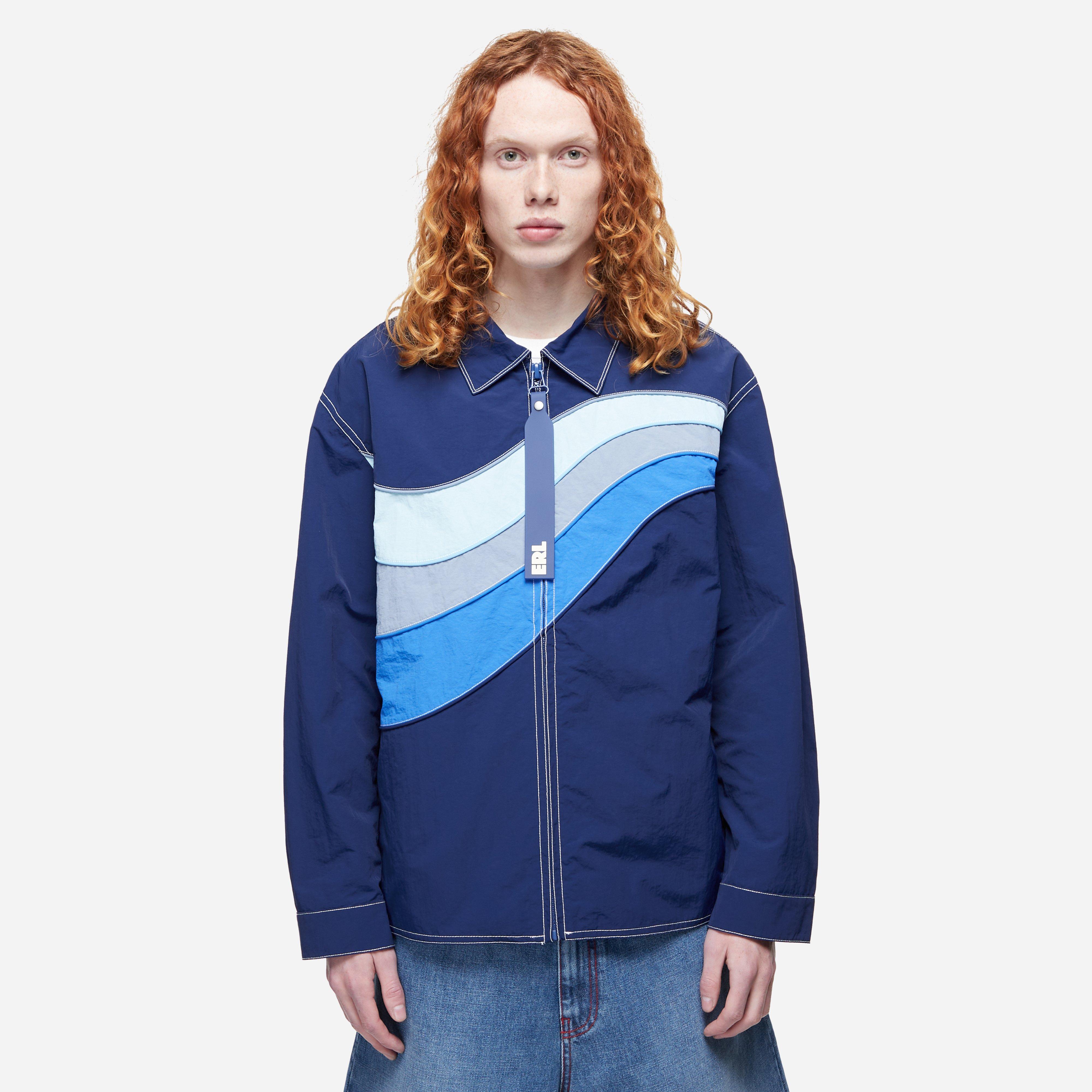 The Surf Jacket is crafted from nylon with a wave panel detail at the chest and contrast stitching. Blue - 100% nylon - Button cuffs - Zip closure - Model is 6'1" and wears size medium.