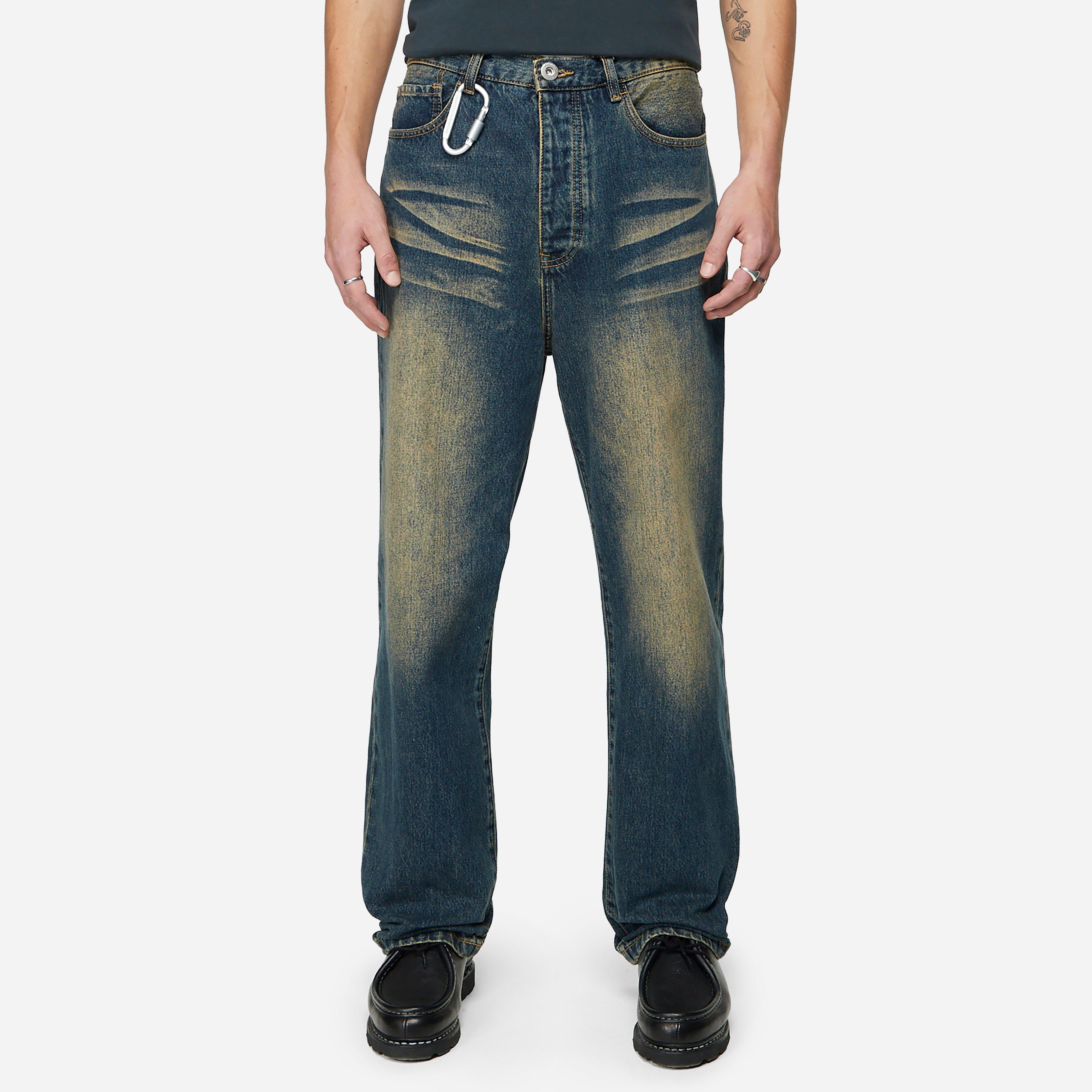 Blue - 100% cotton - 5 pocket - 460gsm - Washed - Carabiner - Loose fit - Model is 6'2.5" and wears a size medium