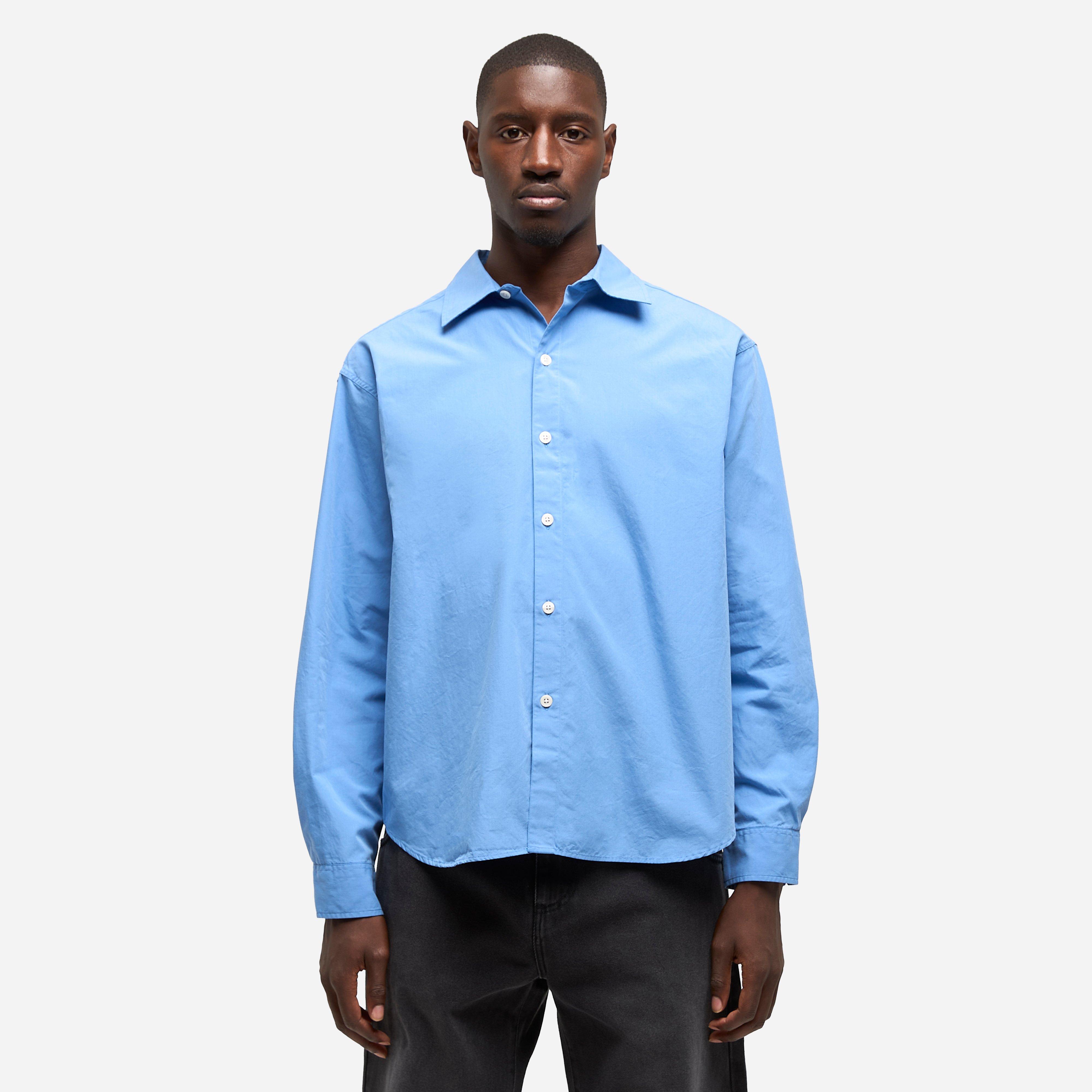 The brand originated with a mission to reinterpret classic menswear pieces through a modern lens, focusing on relaxed and timeless designs. Sigurd Bank's vision for Mfpen includes a strong commitment to sustainability, often using deadstock fabrics and producing collections in collaboration with local European manufacturers. Blue - 100% organic cotton - Relaxed fit - Curved hem - Back yoke pleats - Ivory resin buttons - Garment washed - Fabric & garment made in Portugal - Model is 6'1" and wears a size medium