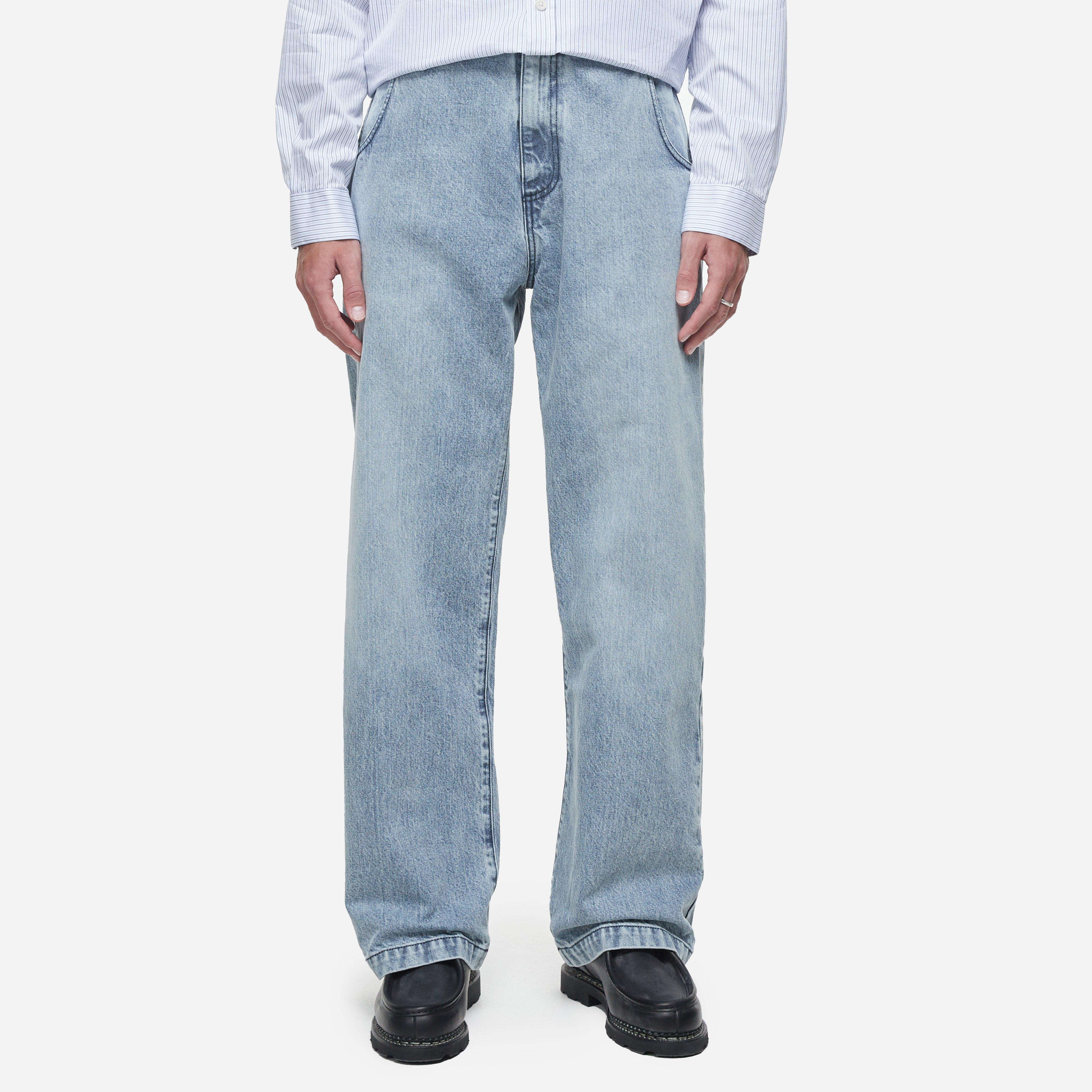 The brand originated with a mission to reinterpret classic menswear pieces through a modern lens, focusing on relaxed and timeless designs. Sigurd Bank's vision for Mfpen includes a strong commitment to sustainability, often using deadstock fabrics and producing collections in collaboration with local European manufacturers. Blue - 60% cotton, 60% recycled cotton - Fabric & garment made in Portugal - Garment washed - Metal buttons - YKK zip - Relaxed, straight fit - Model is 5'11" and wears a size medium.