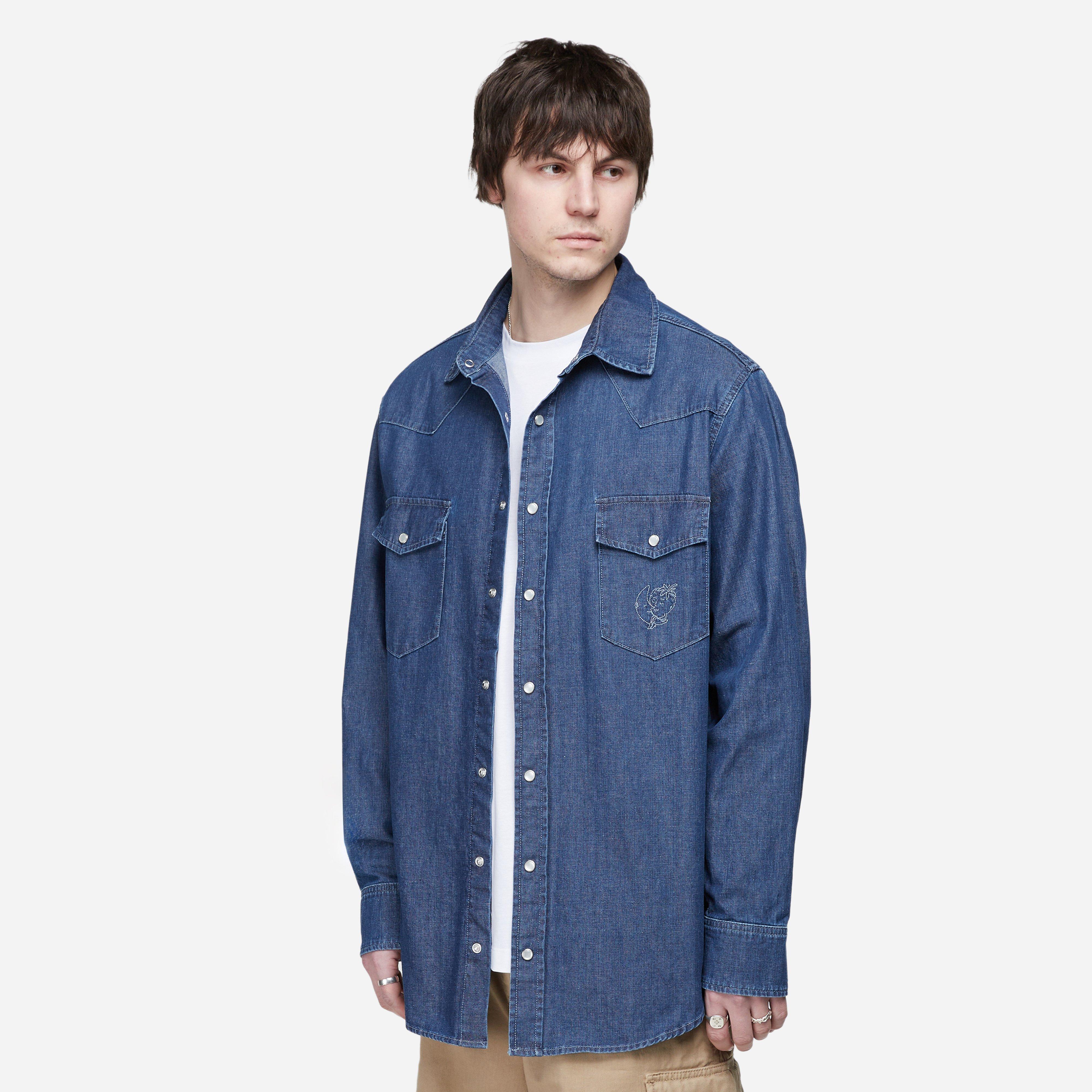 Blue - 100% cotton - Contrast pearl buttons - Flap chest pockets - Button cuffs - Embroidered artwork - Oversized fit - Model is 6'1" and wears a size medium.