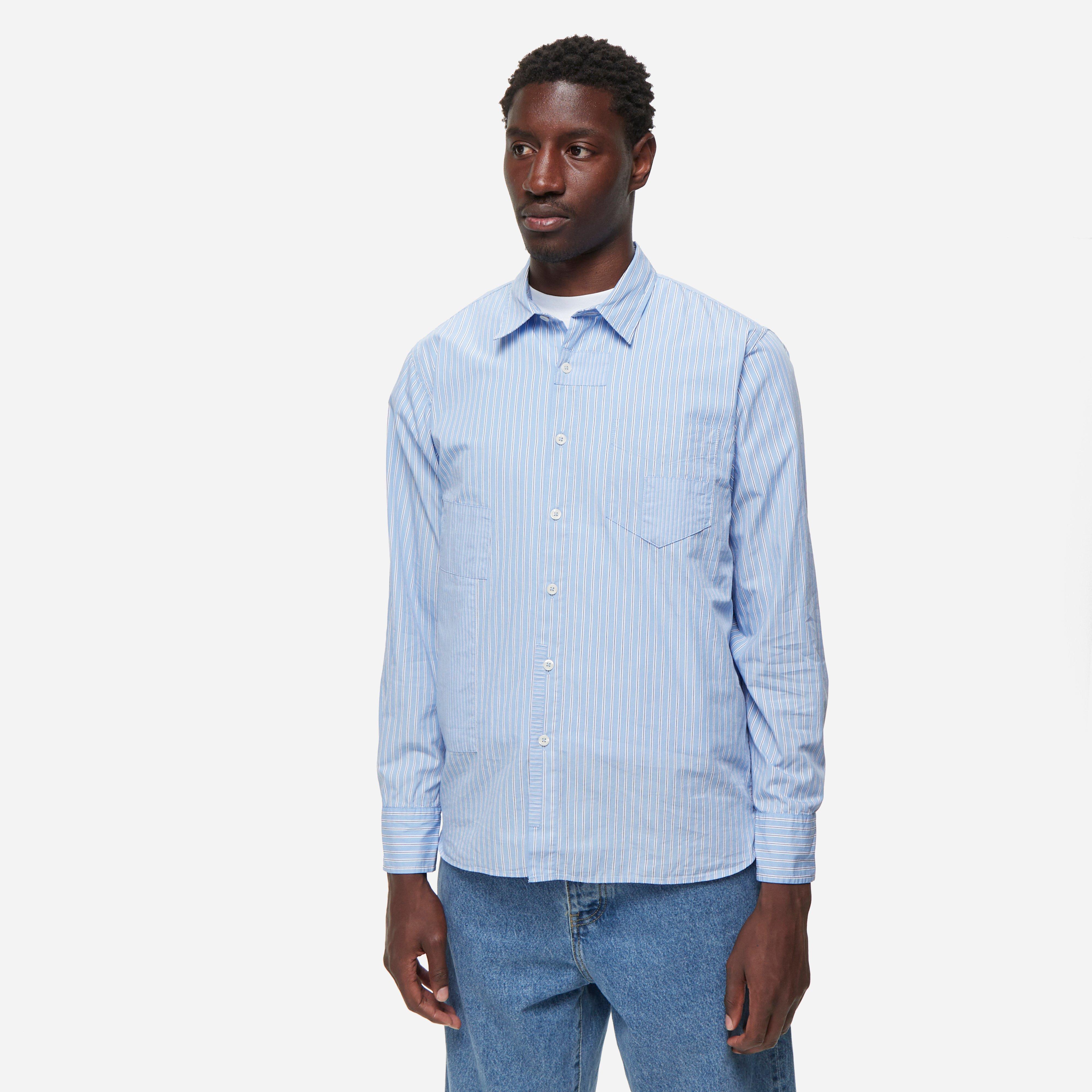 Blue – 100% cotton – Patch pocket – Box pleat – Curved hem – Model is 6’1’’ and wears a size medium.