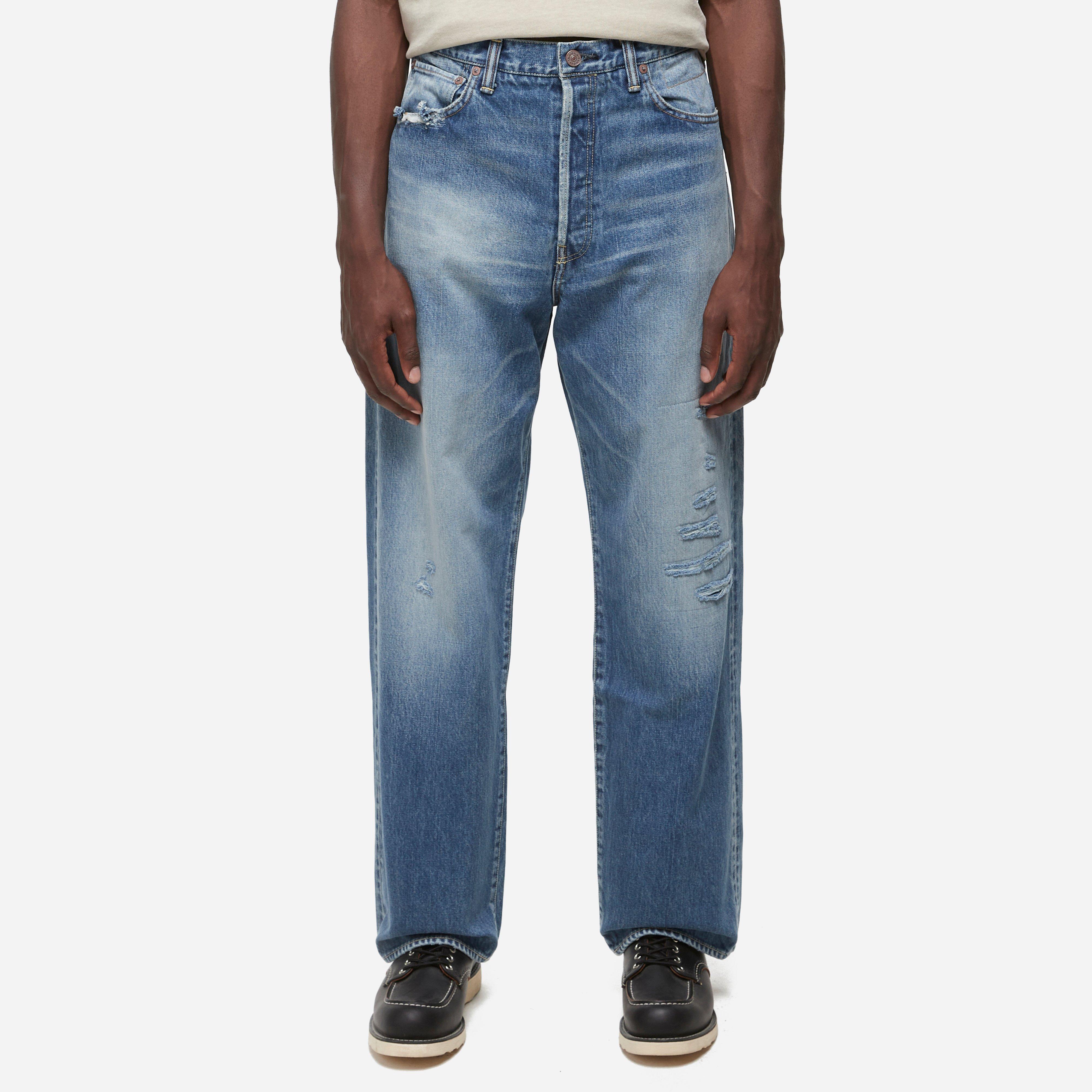 Blue – 100% cotton – Straight leg – Distressed fabric – Hidden zipped pocket – Selvedge edges – Brand backpatch – Model is 6’1’’ and wears a size 32’’.