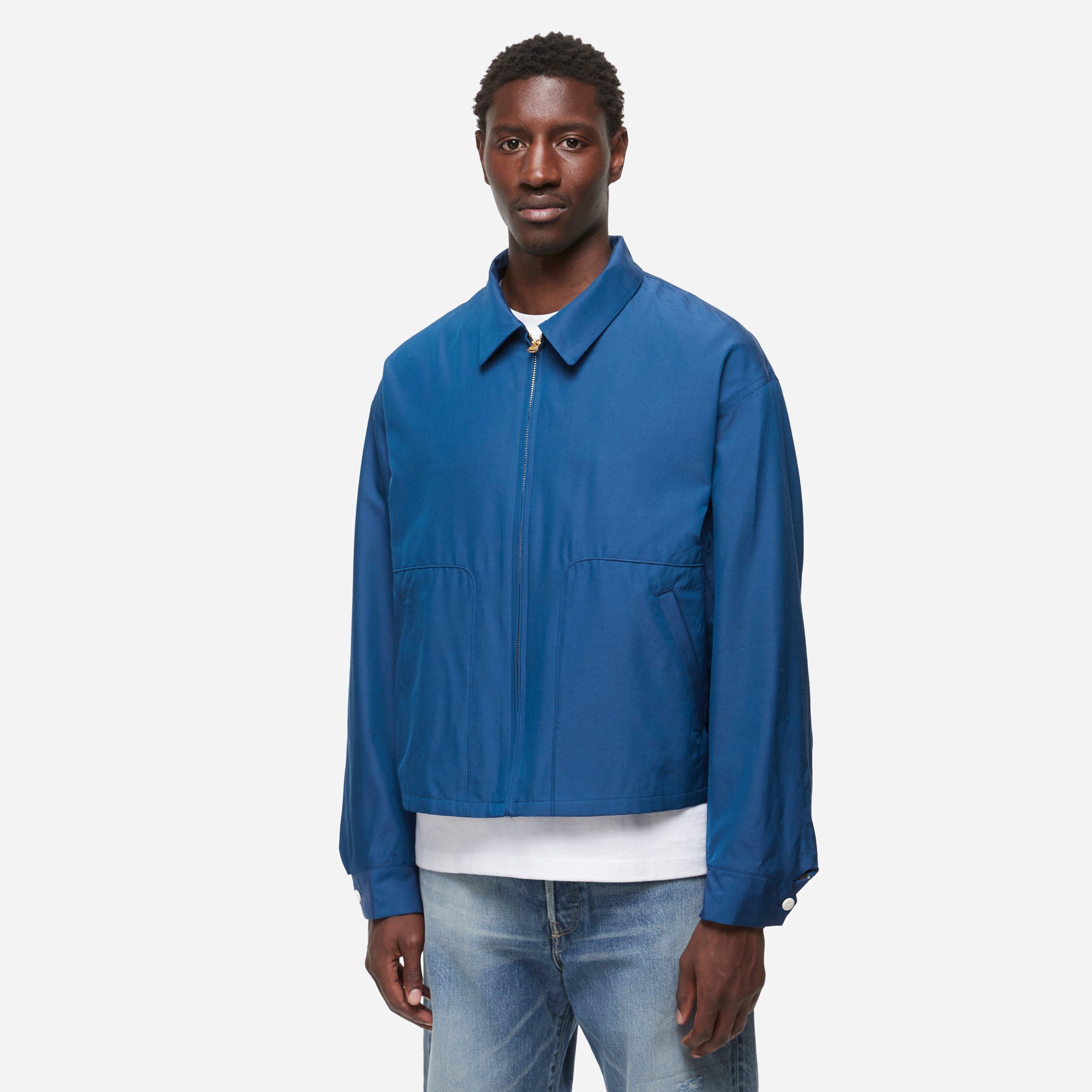 Blue – 62% wool, 38% silk – Cropped fit – High density weave army twill fabric – Pointed collar – Pressed finish – Two hand pockets – Water buffalo buttons – Full zip closure – Typographic back print – Model is 6’1’’ and wears a size 3.