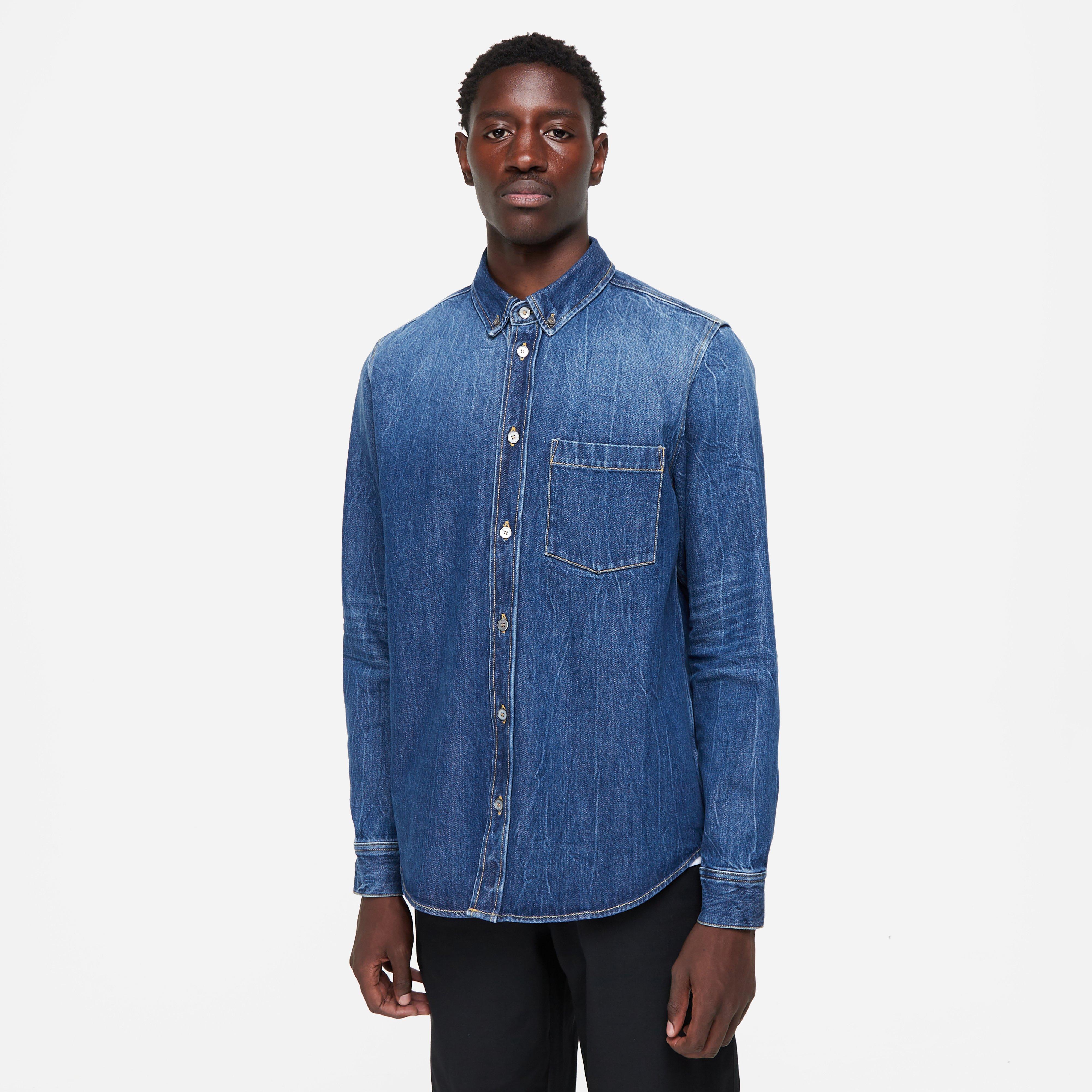 The Ansel Denim Shirt is a casual staple with a vintage, worn-in look and feel. Blue - 100% cotton - Button down collar - Curved hem - Patch front pocket - Visible seams - Brand flag at hem - Regular fit, take your normal size - Model is 6'1" and wears a size medium.
