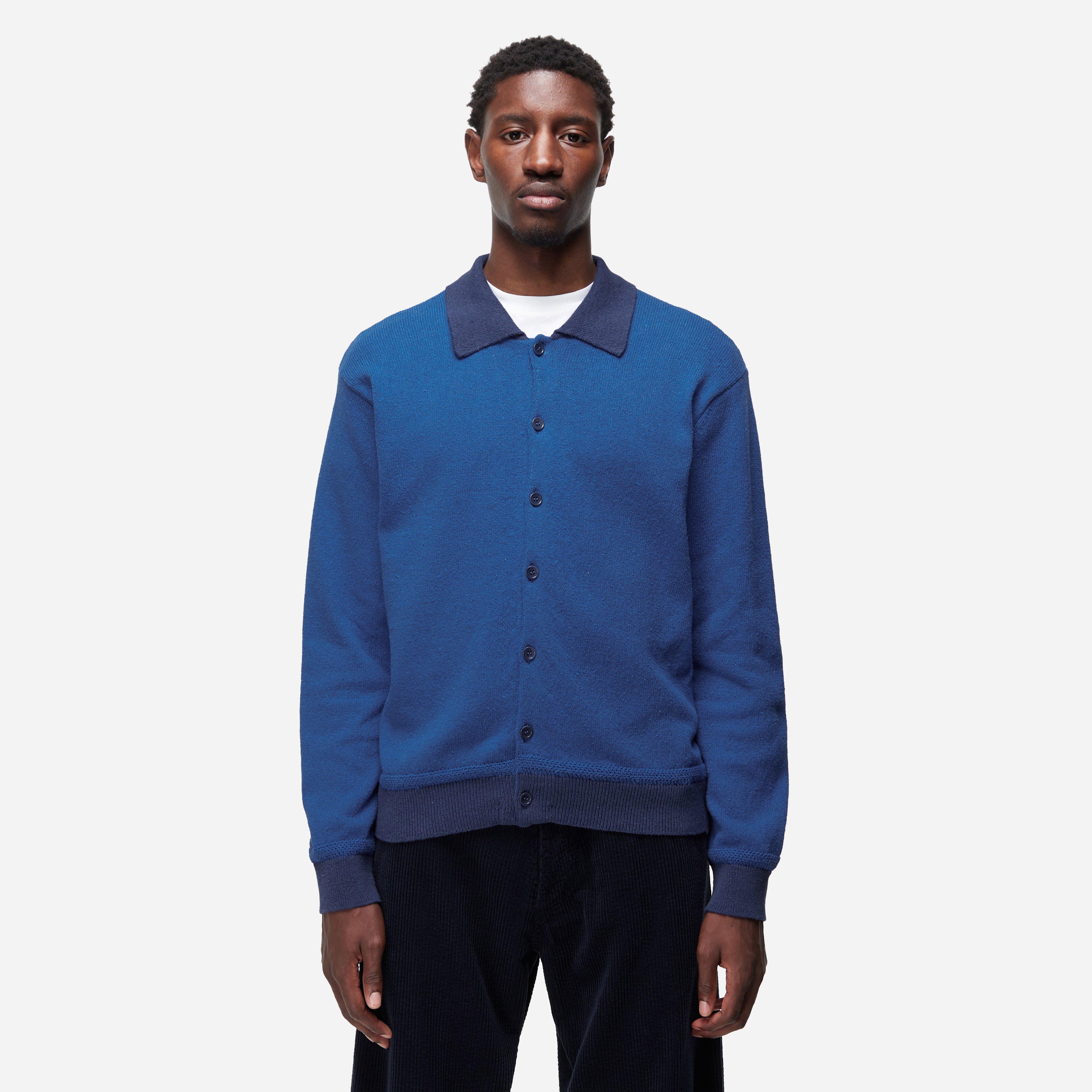 Blue - 75% Recycled Cotton 20% Recycled Polyester 5% Other - Made in Portugal - Knitted collar - Two tone - Corozo buttons - Contrast rib collar, hem & cuffs - Regular fit - Model is 6'1" and wears size medium.