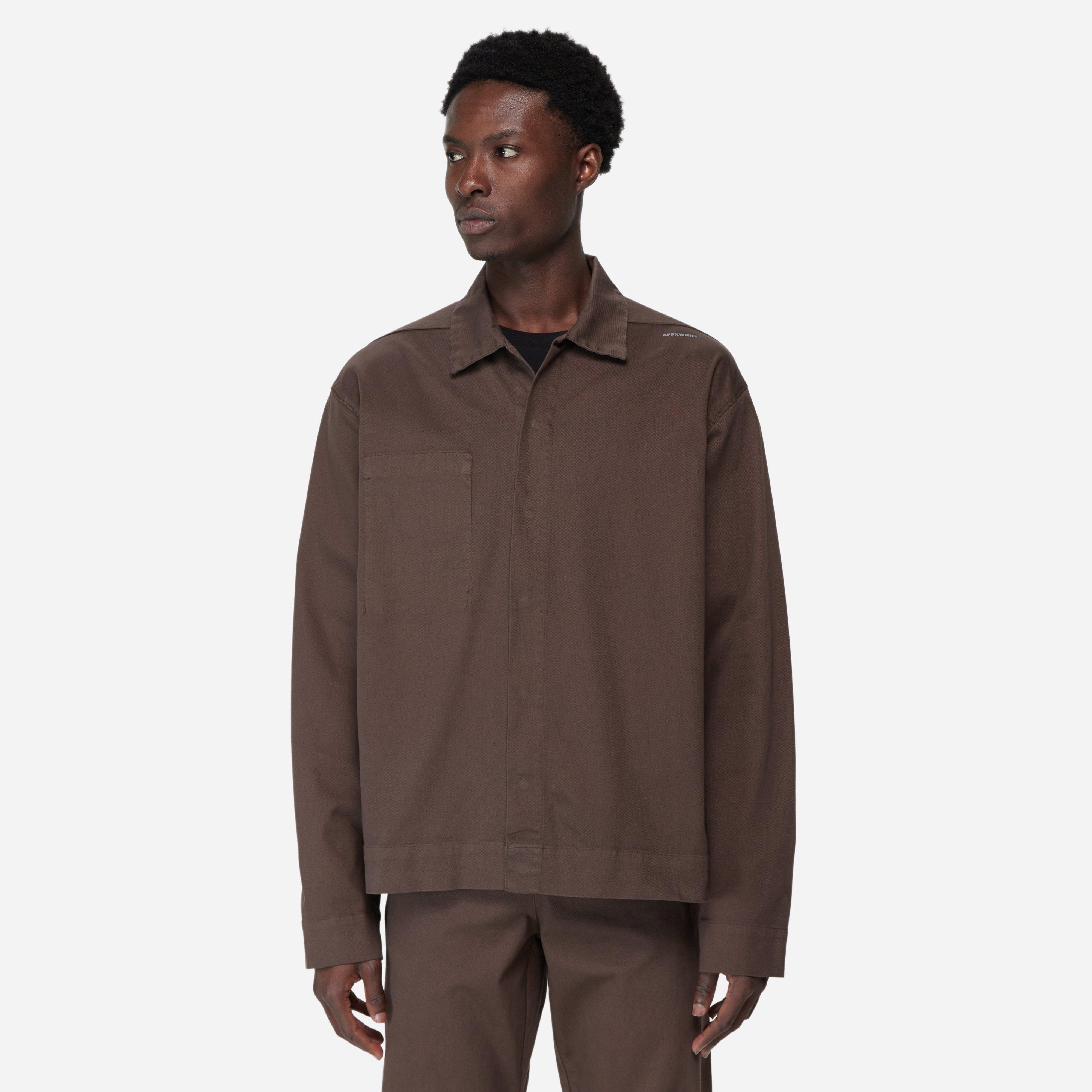 The WRKS Jacket is an ultra-versatile lightweight jacket in the brand's fluid AW23 collection. The Jacket suits layering and has a tough outer fabric with an overdye finish. Brown - 100% cotton - Object dye - Mid-weight - Snap front fastening - Cuff snap adjustment - Printed branding - Made in Portugal - Regular fit, take your normal size - Model is 6'1" and wears a size medium.