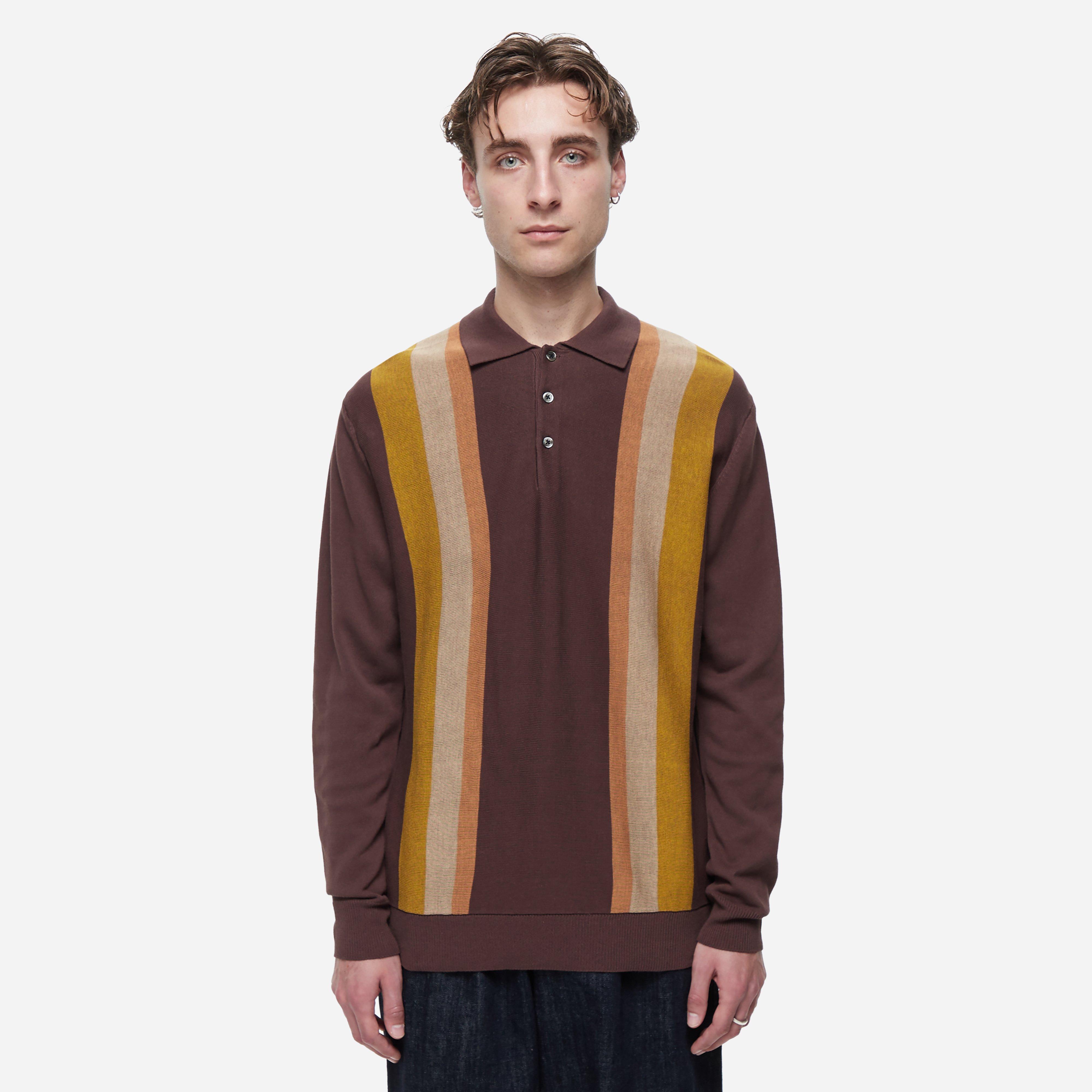 Brown - 100% wool - Jersey knit stripes - Button placket - Ribbed trims - Fits slightly smaller, we suggest sizing up if in between sizes - Model is 5'11" and wears a size medium.