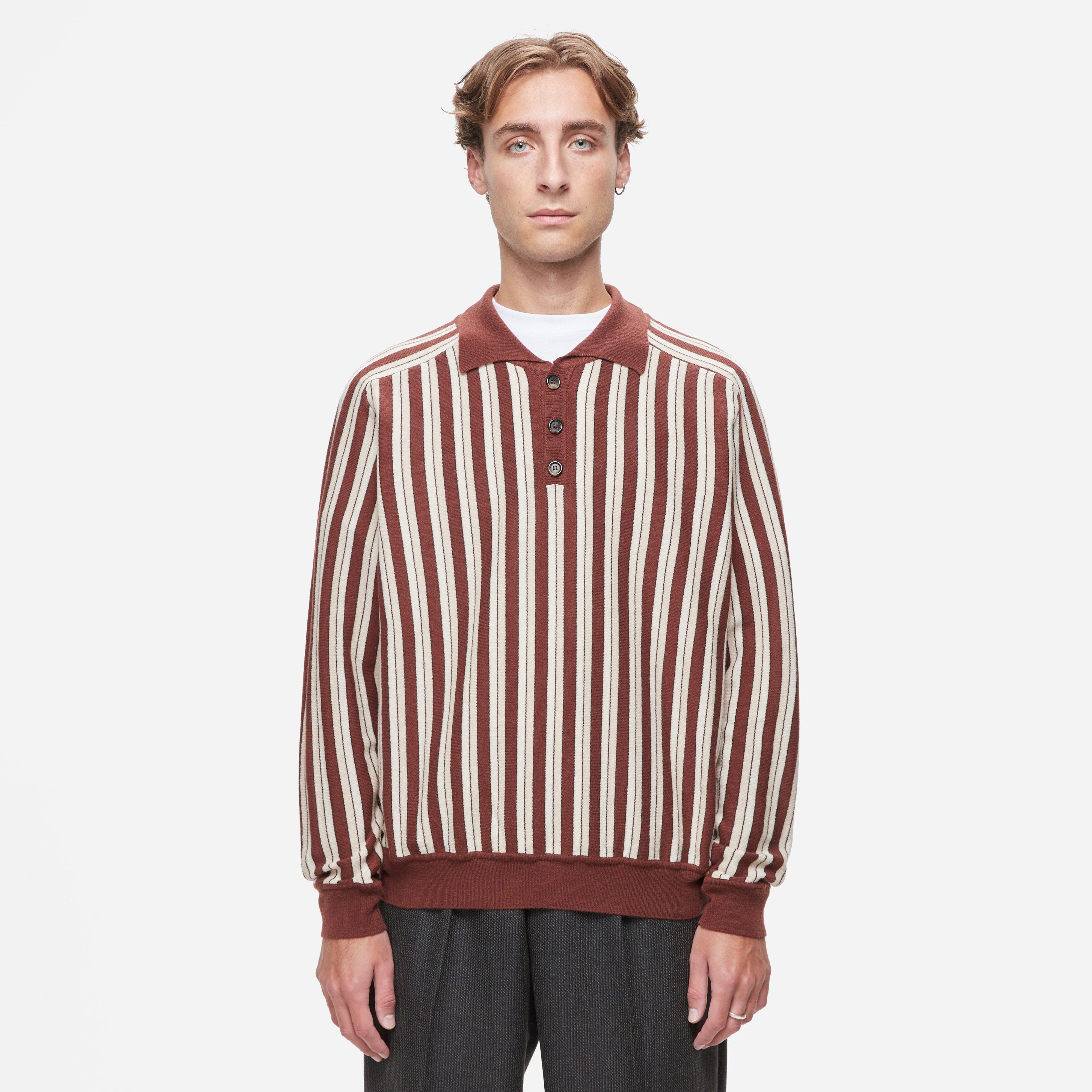 It often incorporates vintage textiles and traditional craftsmanship to create pieces that celebrate nostalgia and personal narratives. This Hogan Polo is inspired by an Italian cardigan from the 1940s-1950s. Brown - 70% merino wool 30% cashmere - 3 button placket - Ribbed cuffs and hem - Made in Romania - Model if 5'11" and wears a size medium.