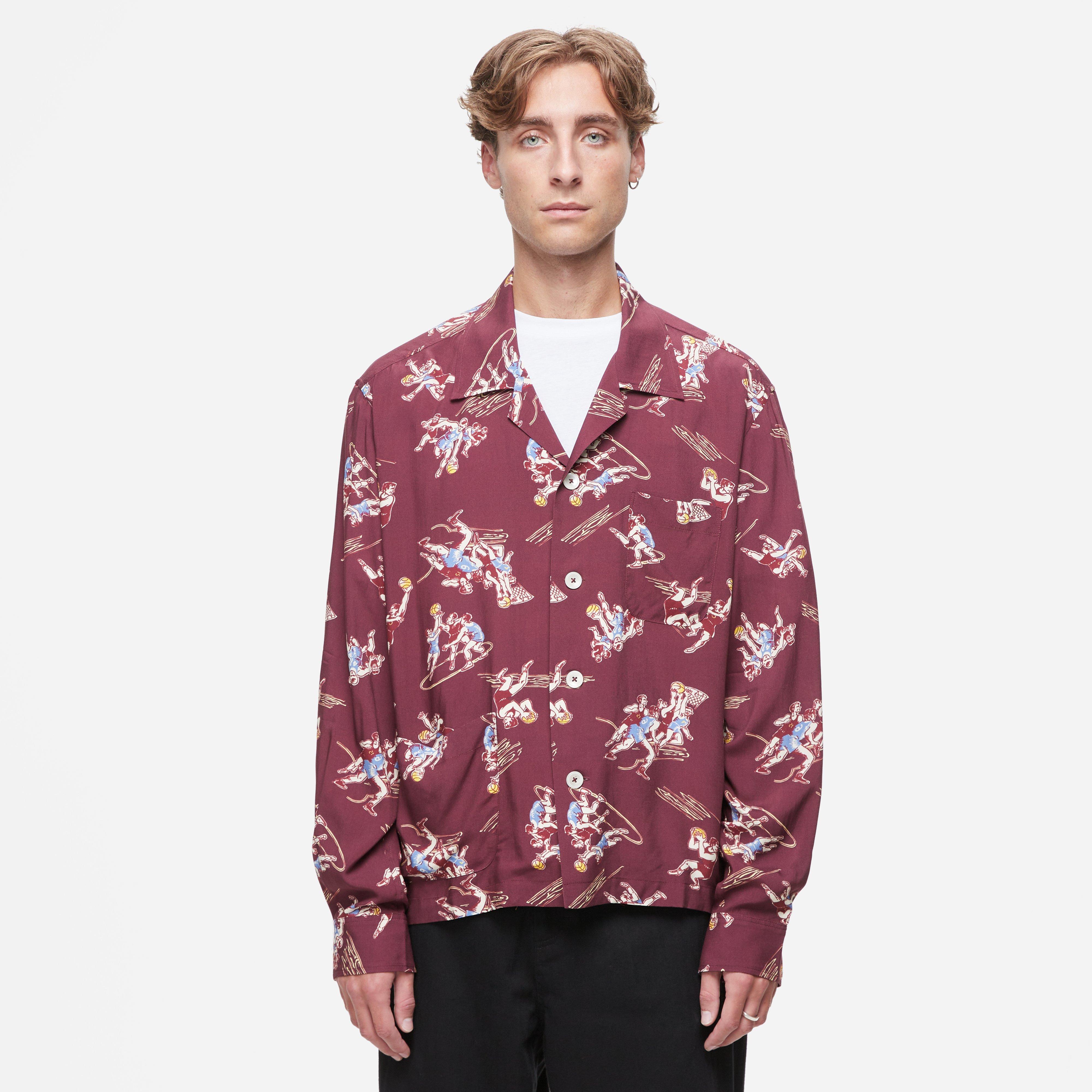 It often incorporates vintage textiles and traditional craftsmanship to create pieces that celebrate nostalgia and personal narratives. The Layup Shirt is inspired by a piece of fabric from 1940s-1950s era. Brown - 100% viscose - Made in Portugal - Model is 5'11" and wears a size medium.
