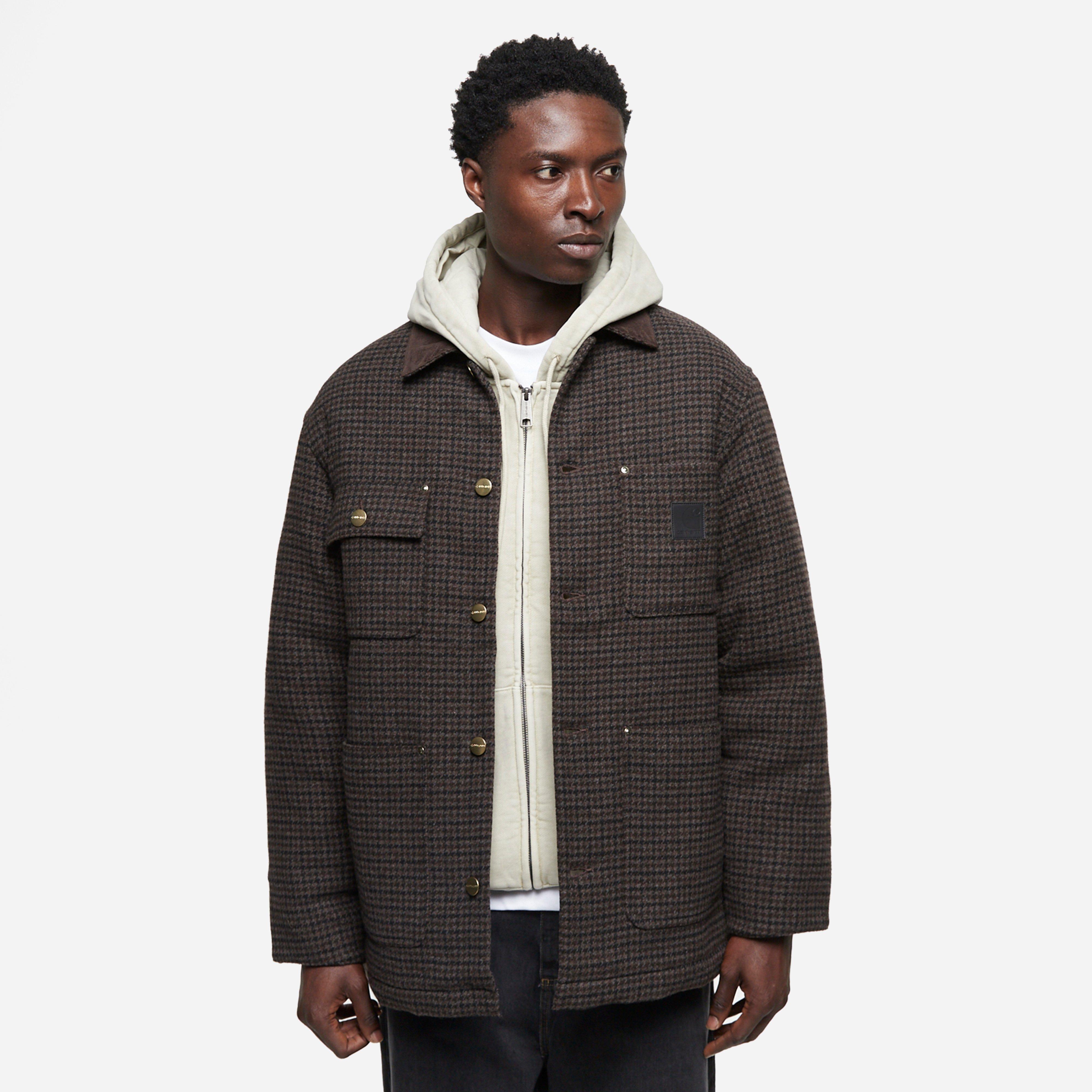 The Lowis Chore Coat is made from heavyweight poly-wool fabric and features an all-over houndstooth pattern which originated in the Scottish Lowlands. - 60% polyester/40% wool - Corduroy collar - Diamond quilt lining - Houndstooth pattern - Adjustable cuffs - Button closures - Two chest pockets - Two lower front pockets - Artificial Square Label - Model is 6'2'' and wears a size medium.