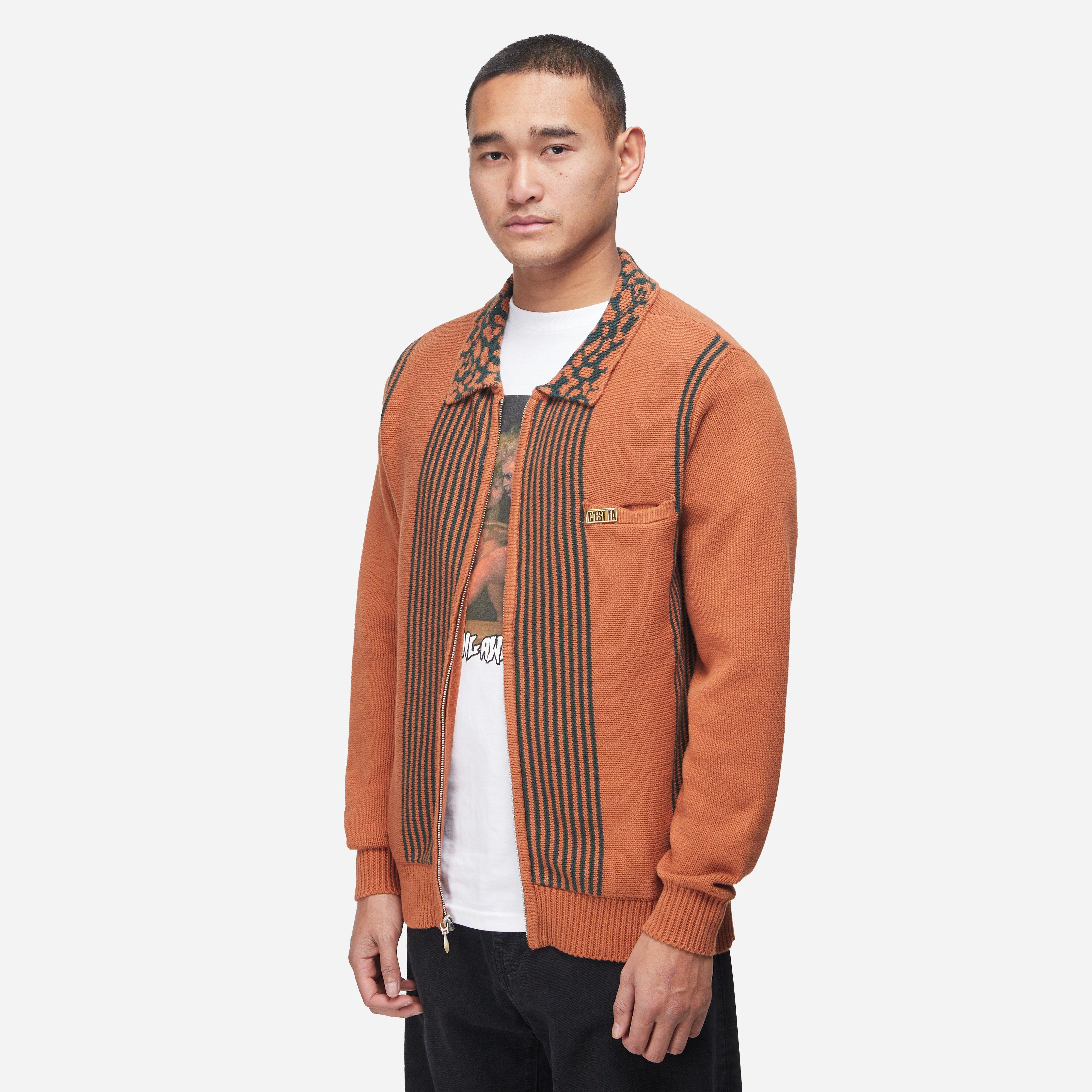 A piece merges a Polo Shirt and Cardigan, finding timeless appeal with preppy jacquard stripes, glamorous artwork at the collar and a custom brass pin. Brown - 100% cotton - Jacquard stripes - Ribbed trims - Zip up - Brass pin - Regular fit, take your normal size - Model is 6'1" and wears a size medium.
