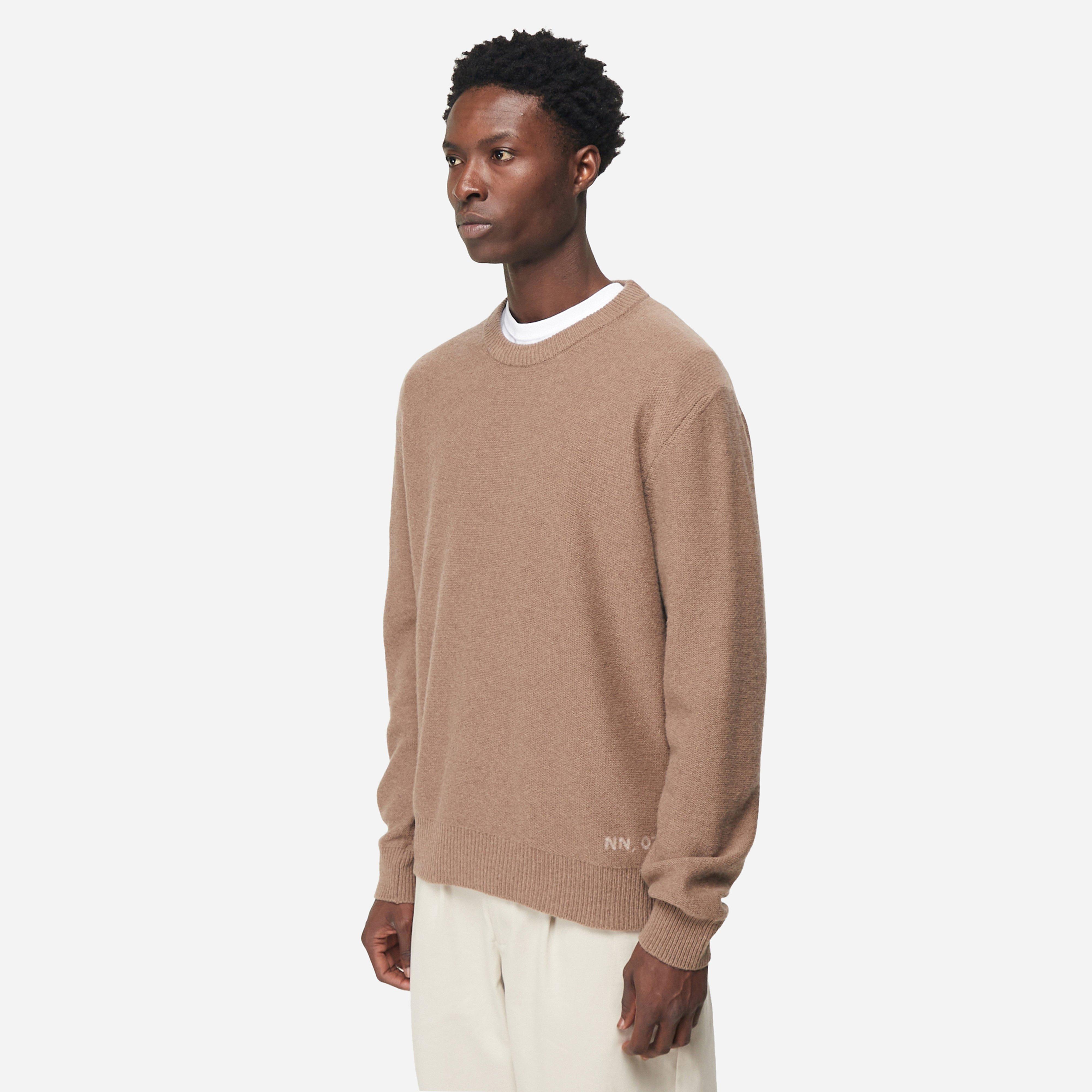 Brown - 100% wool - Ribbed trims - Branding applique at hem - Regular fit, take your normal size - Model is 6'1" and wears a size medium.