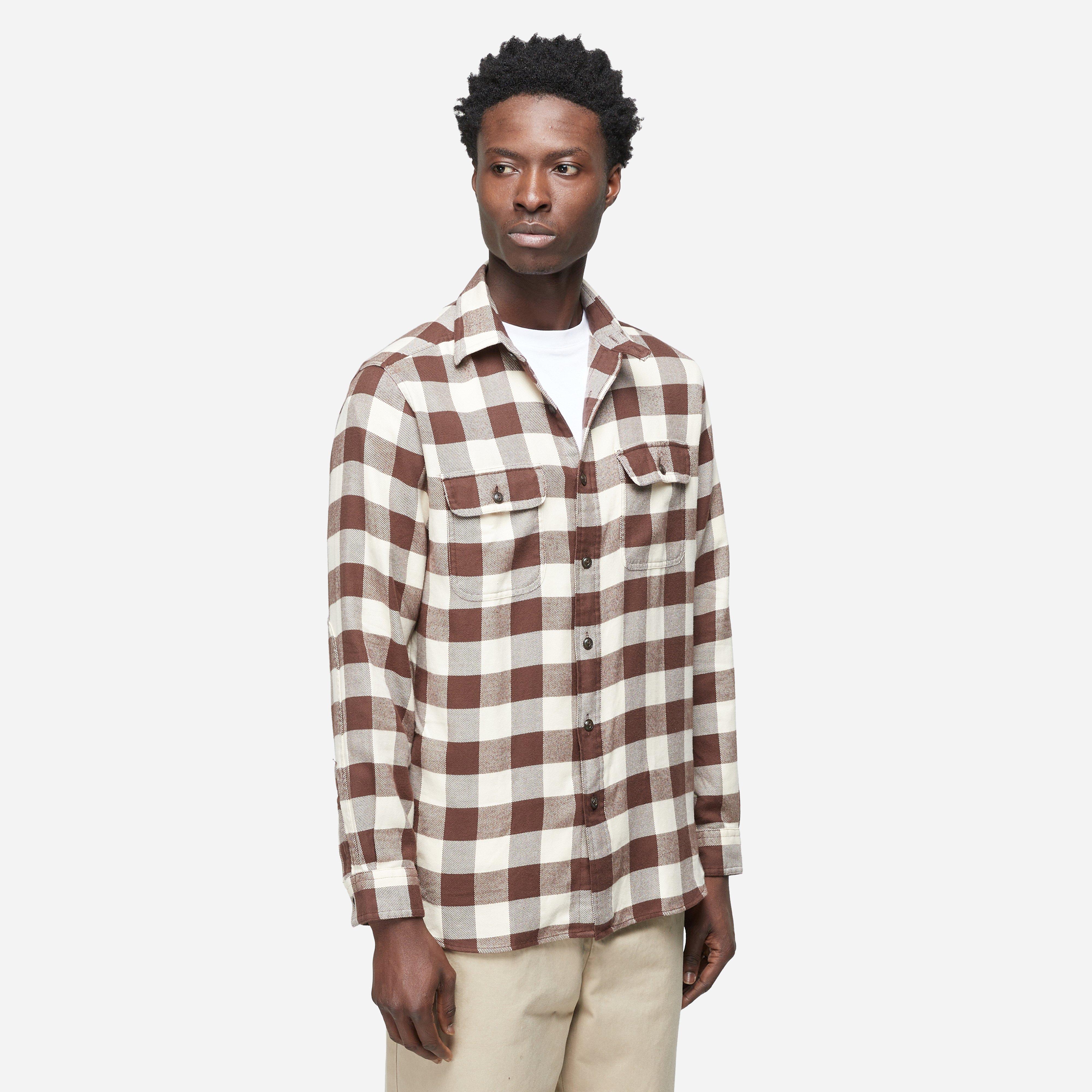 The piece is cut from sturdy heavyweight cotton in a classic check pattern. Brown - 100% cotton - Curved hem - Button cuffs - Chest pockets - Regular fit, take your normal size - Model is 6'1" and wears a size medium