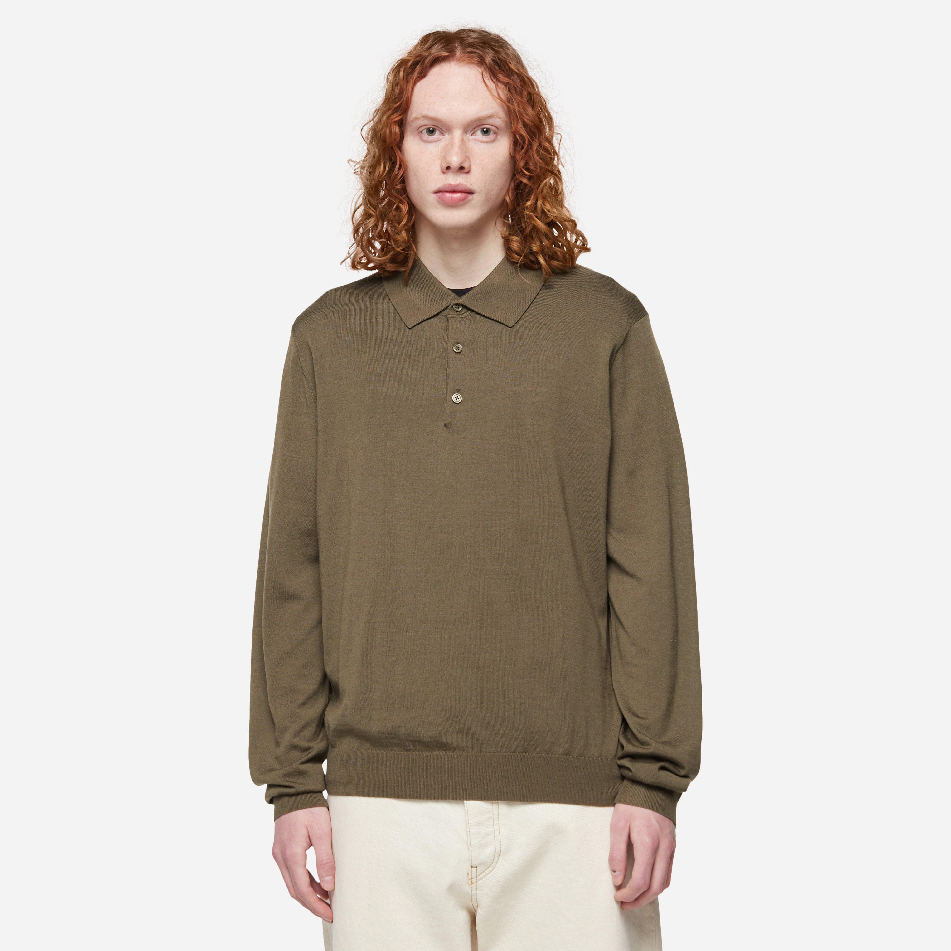 Brown – 100% merino wool – Fine wool yarn – Light gauge knit – Mother of Peral buttons – Model is 6’1’’ and wears a size medium.