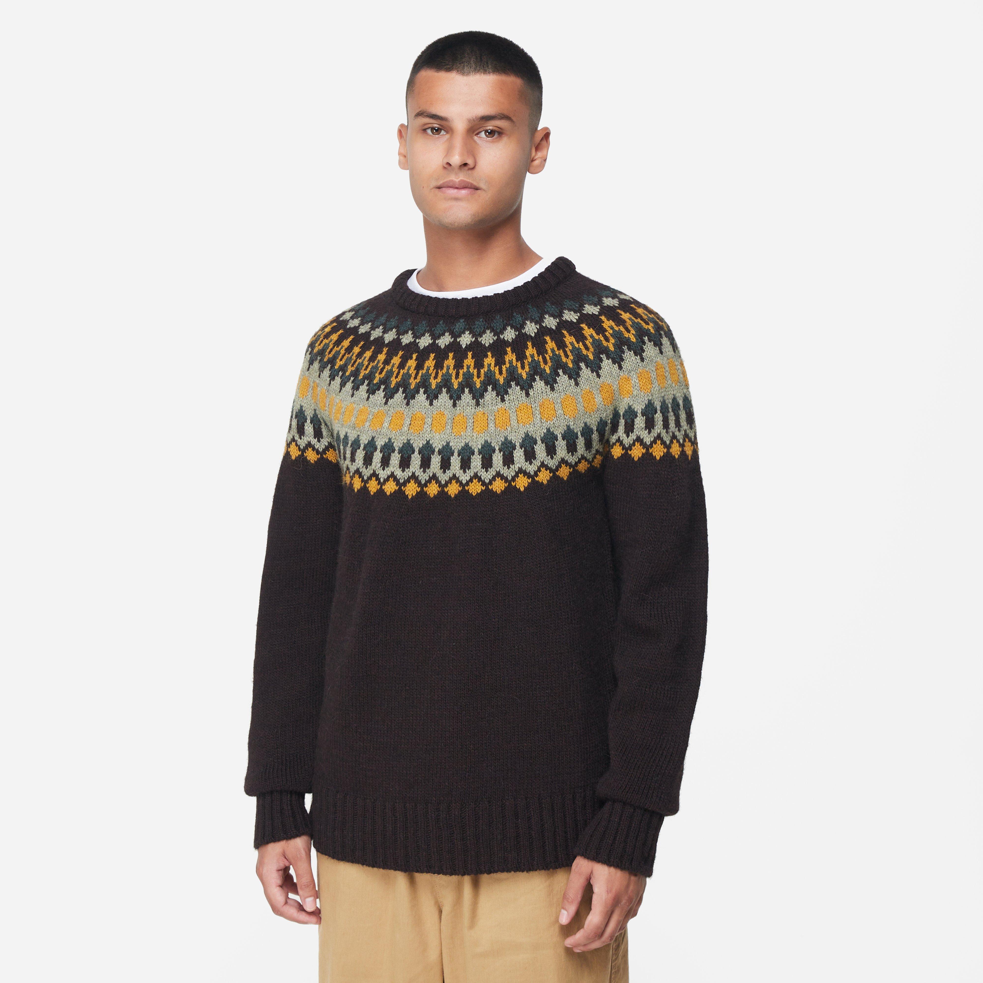 The brand uses an alpaca-wool blend to keep emphasis on classic knitwear - a sentiment reinforced by a fairisle-inspired pattern. Brown - 60% acrylic, 15% alpaca, 15% wool, 10% viscose - Ribbed trims - Made in Portugal - Regular fit, take your normal size - Model is 6'1" and wears a size medium.