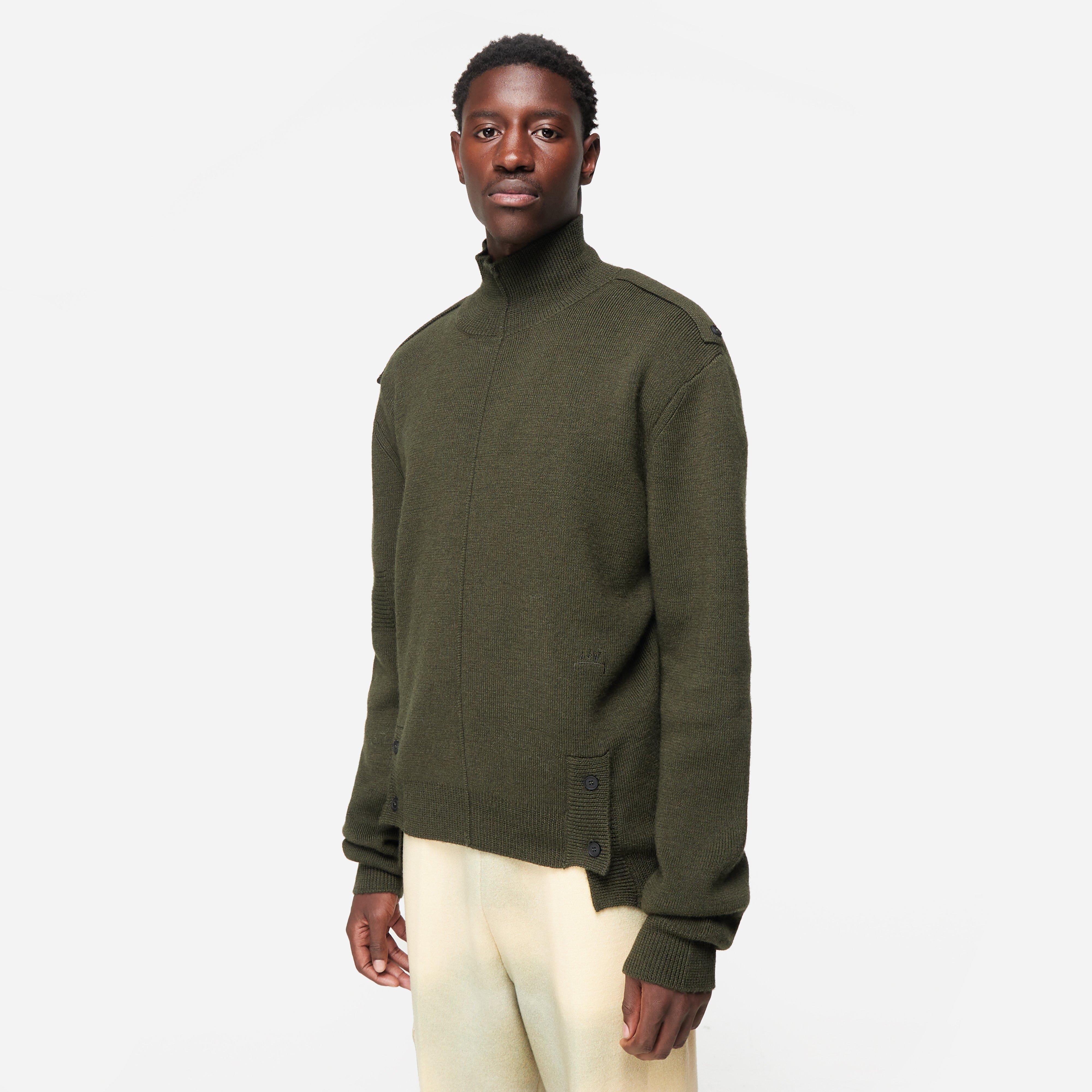 The piece's aesthetic is understated - ACW opt for tonal bracket embroidery and a vertical centre seam for structure. Green - 100% wool - Reverse ridge stitch detailing - Fully fashioned construction - Front hem with button opening - Ribbed trims - Dropped shoulder with epaulets - Embroidered branding - Regular fit, take your normal size - Model is 6'1" and wears a size medium.