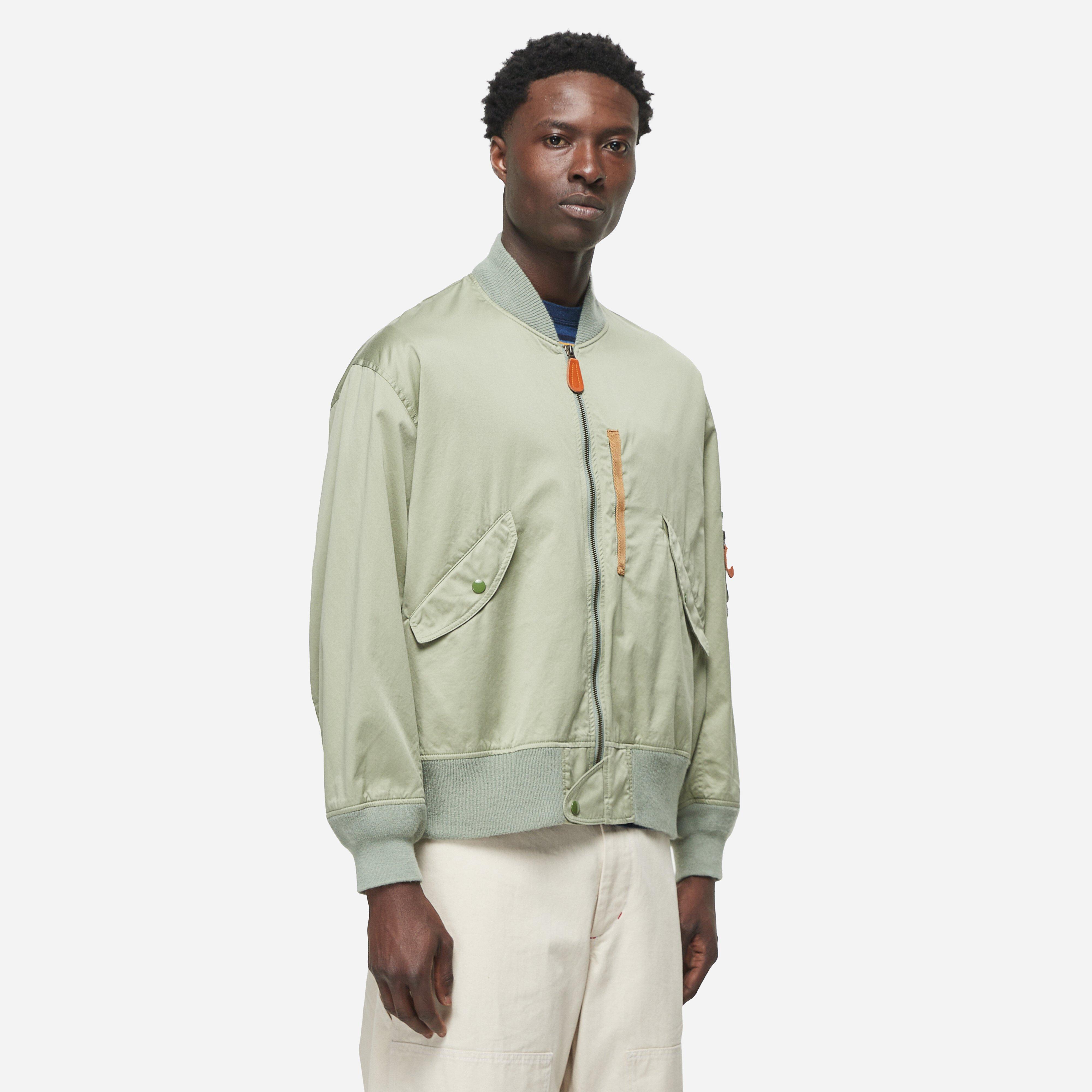 The MIL Flight Bomber Jacket a tough Supima cotton construction. Sage - 100% cotton - Regular fit - 2-way zip closure - Curved rib collar - Stretch rib bottom cuffs - Patch pocket - Model is 6’2’' and wears a size medium.