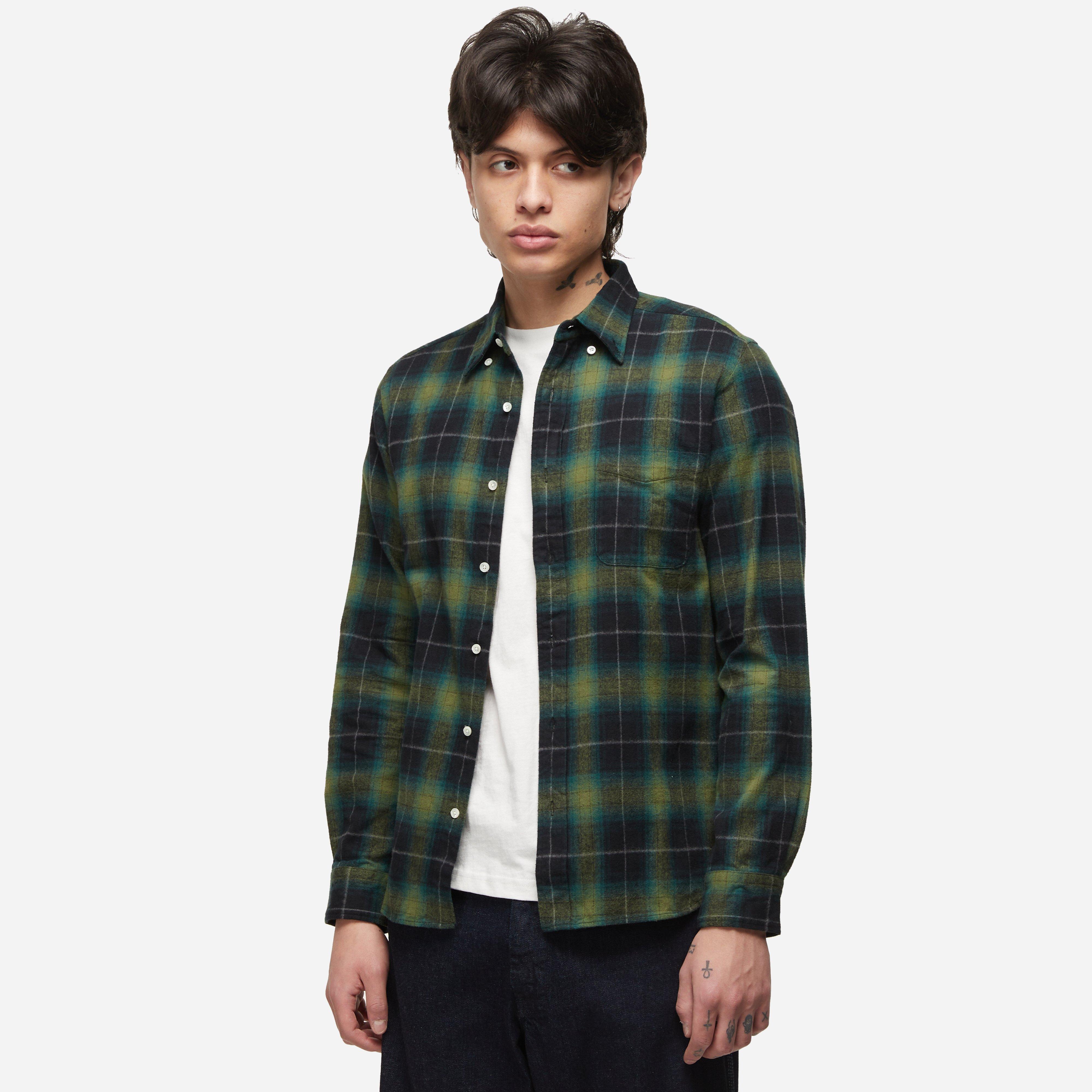 The classic tartan check and fluffy brushed handle make a great fall-winter style. Green - 100% cotton - Curved hem - Patch pocket - Dyed fabric - Made in Japan - Regular fit, take your normal size - Model is 6'1" and wears a size medium.