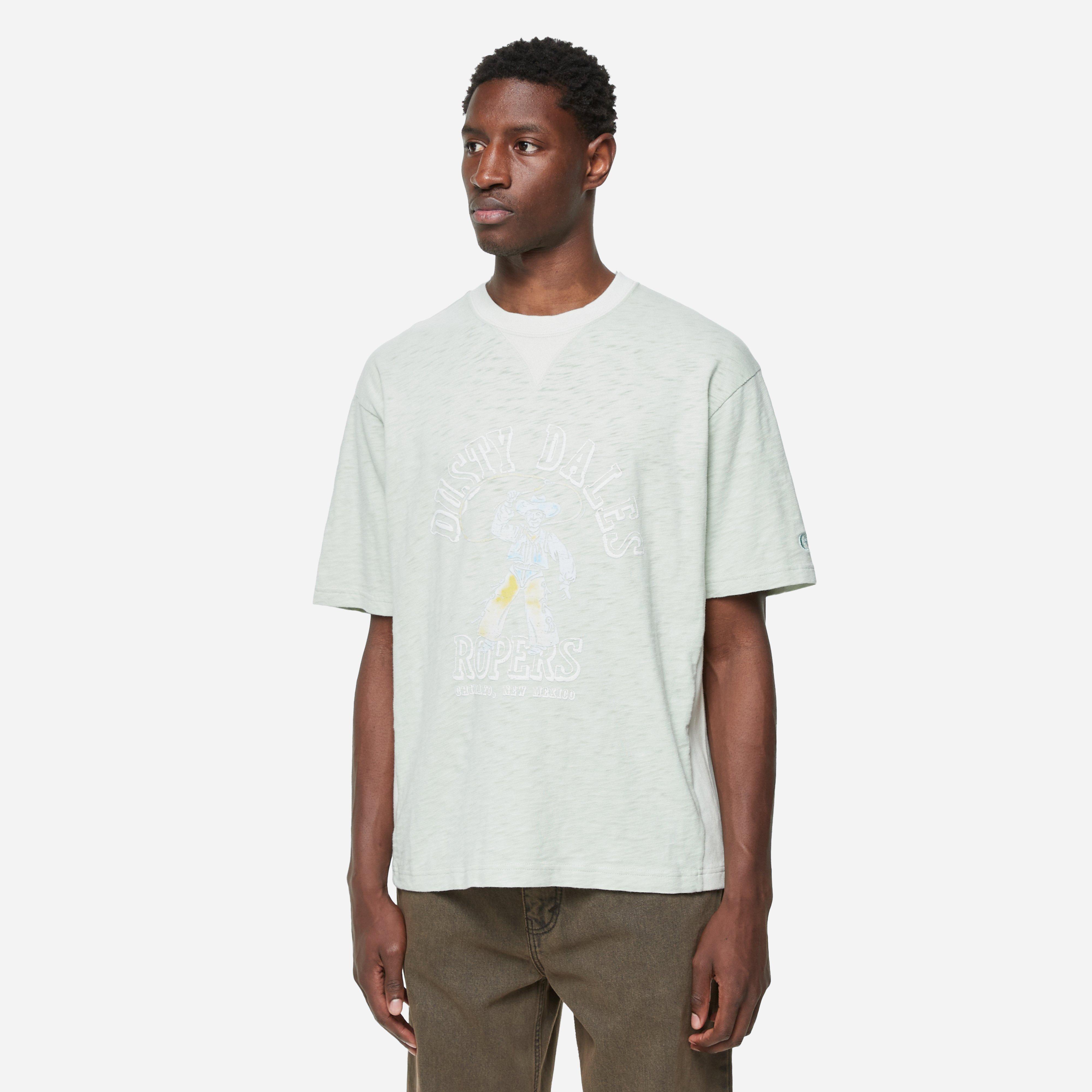 Green – 100% cotton – Loose fit – 240gsm slub fabric – Crew neck – Model is 6’1’’ and wears a size medium.
