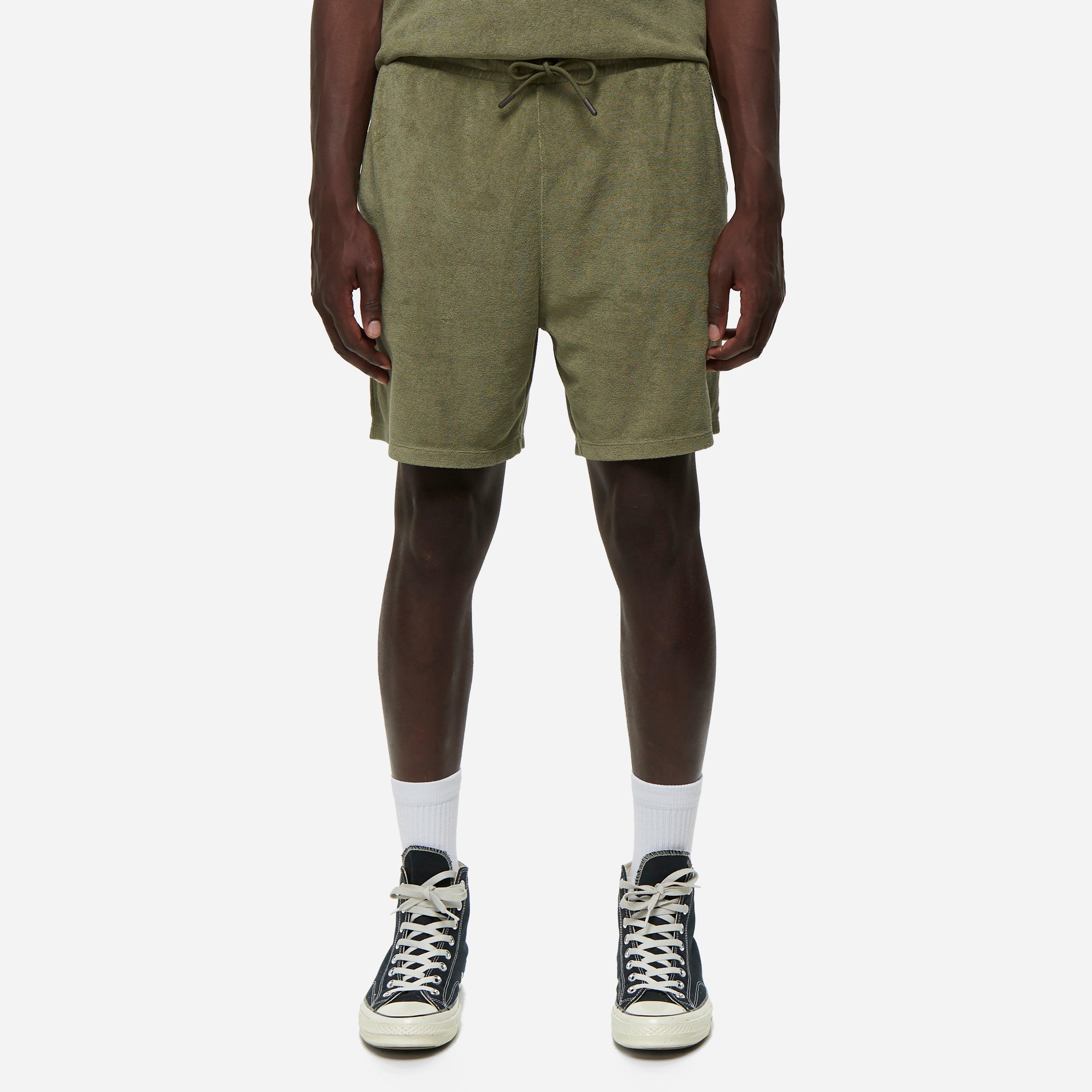 The Chino Short is made from terrycloth fabric with a worn in finish. Green - 83% cotton, 17% polyester - Side pockets - Stretch waist - Relaxed fit - Made in Portugal - Model is 6'2" and wears a size medium