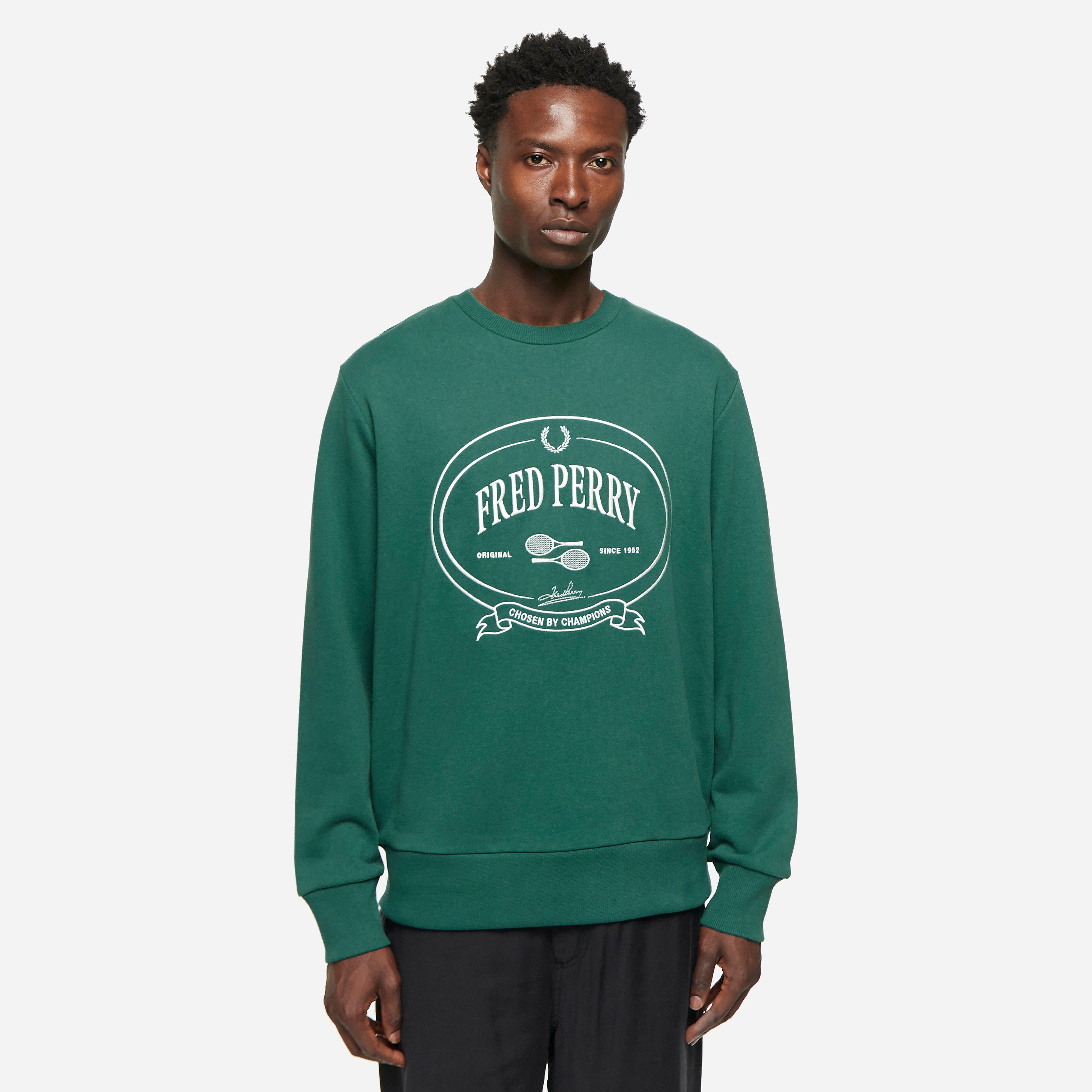 The curated capsule is a homage to tennis club leisurewear and features elevated garments that take inspiration from archive '70s designs. This sweatshirt is crafted from cotton loopback and is decorated with branding from the label's 1970s catalogue. Green - 100% cotton - Regular fit - Crew neck - Embroidered Fred Perry branding - Model is 6'2" and wears a size medium.