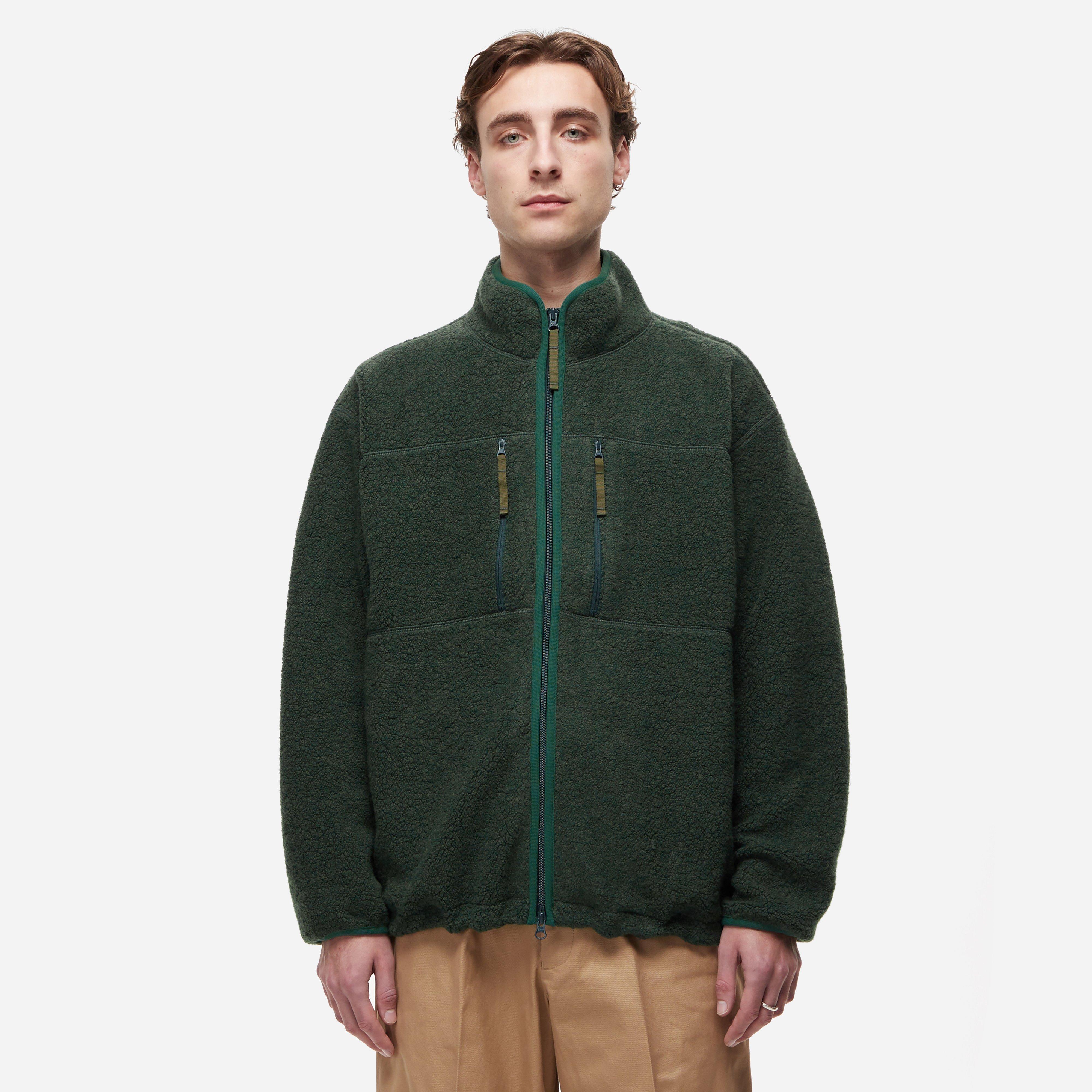 The Antonio Wool Zip Up is relaxed silhouette made of thick fleece. Green - 57% wool, 26% polyester, 14% nylon, 1% acrylic, 1% rayon, 1% cotton - Stand up collar - Chest and side pockets - Model is 5'11" and wears size medium.