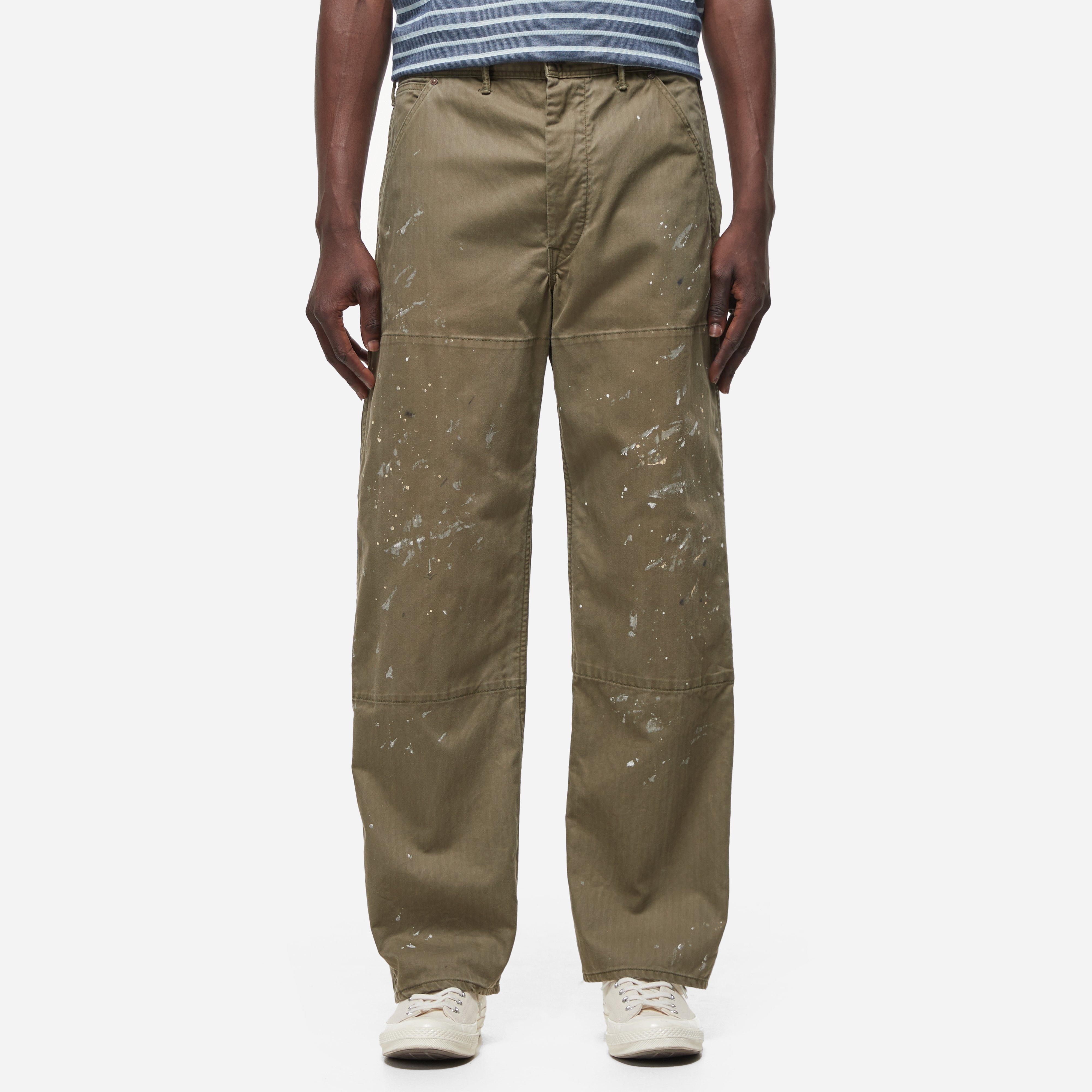 The pair feature American made buttons and rivets with hand finished paint splatters for a worn in work. Green - 7.8oz herringbone cotton - Straight leg - 10.5" rise - 32" inside leg length as standard.