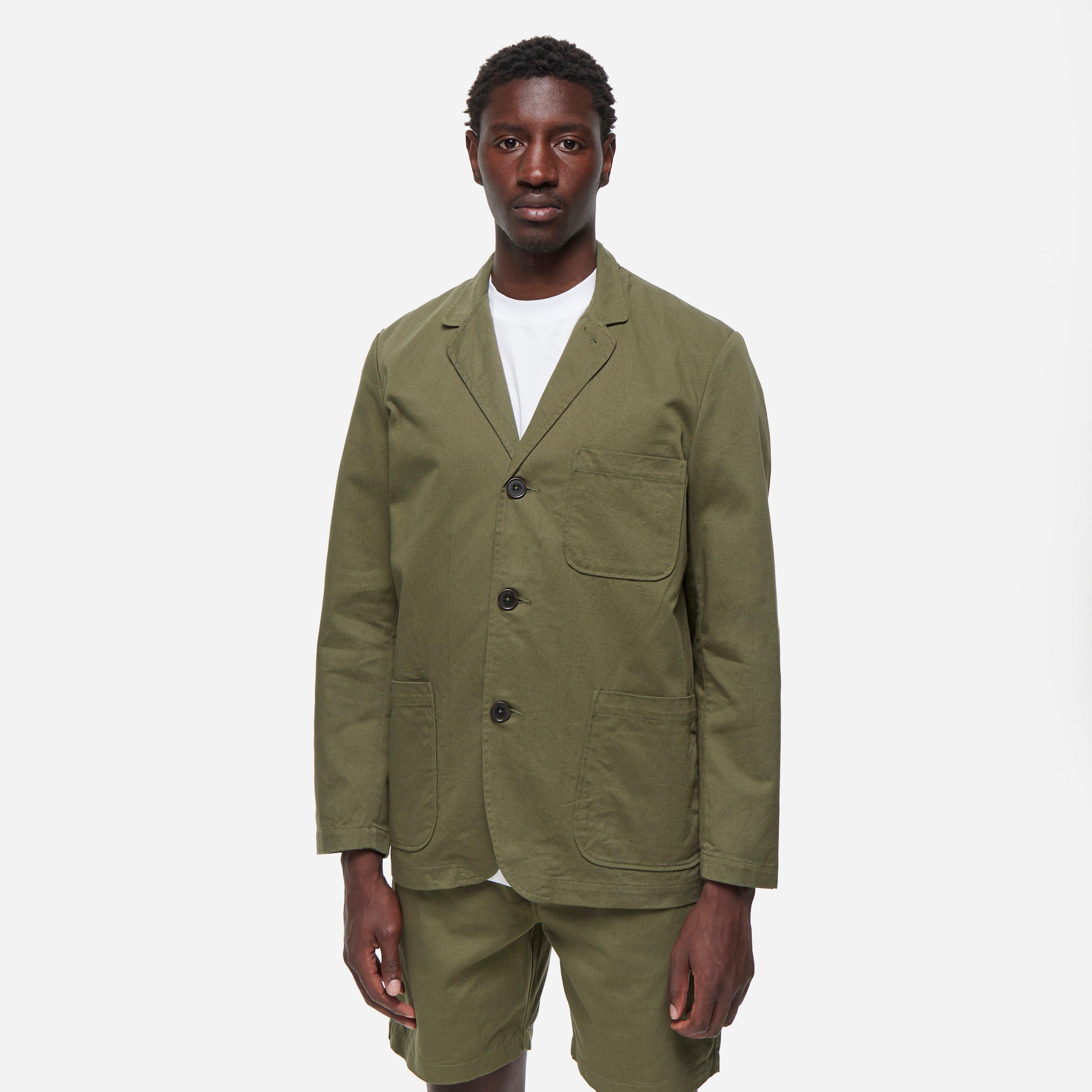 Olive – 100% cotton – Relaxed fit – Buttoned lapel – Three patch pockets – Two piece sleeve – Model is 6’1’’ and wears a size medium.