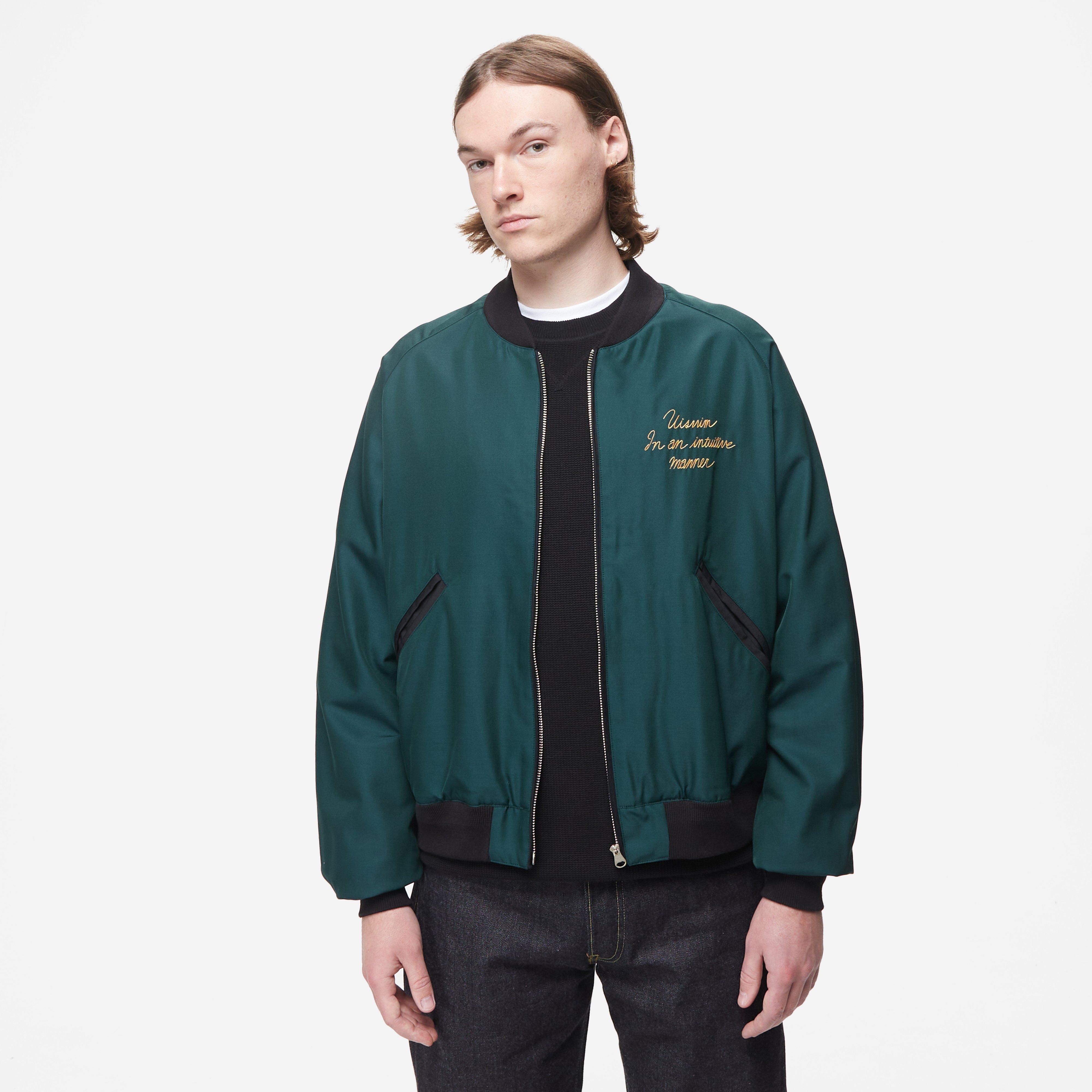 Green – 62% wool, 38% silk – Regular fit – Cropped hem – Ribbed trims – Rayon lining – Two hand pockets – Typographic embroidery – Model is 6’0’’ and wears a size 3.