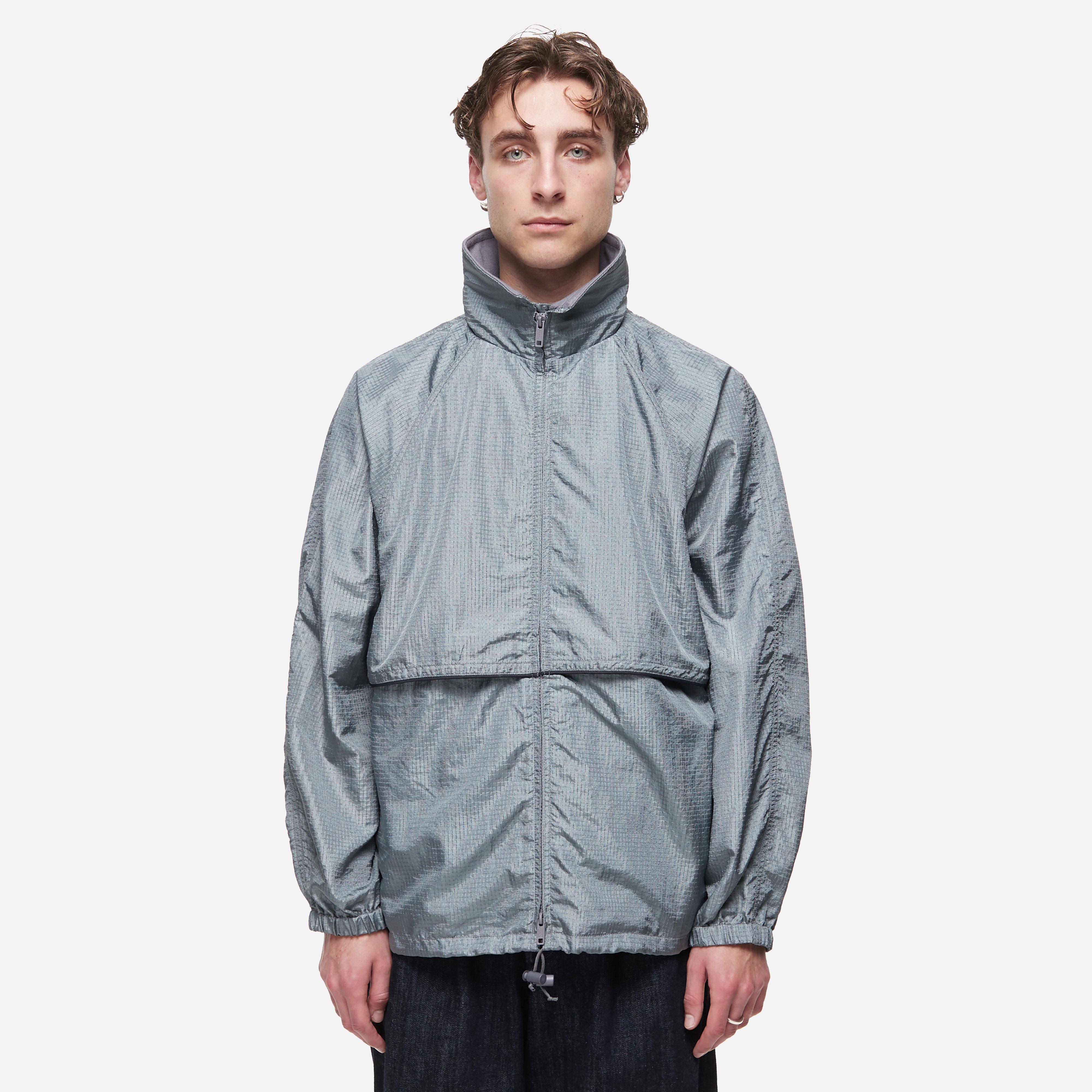 The Mil Jacket is made from lightweight ripstop with a sheen finish. Grey - 100% nylon - 2 way zip - High neck - Loose fit - Side pockets - Hidden hood - Model is 5'11" and wears a size medium.