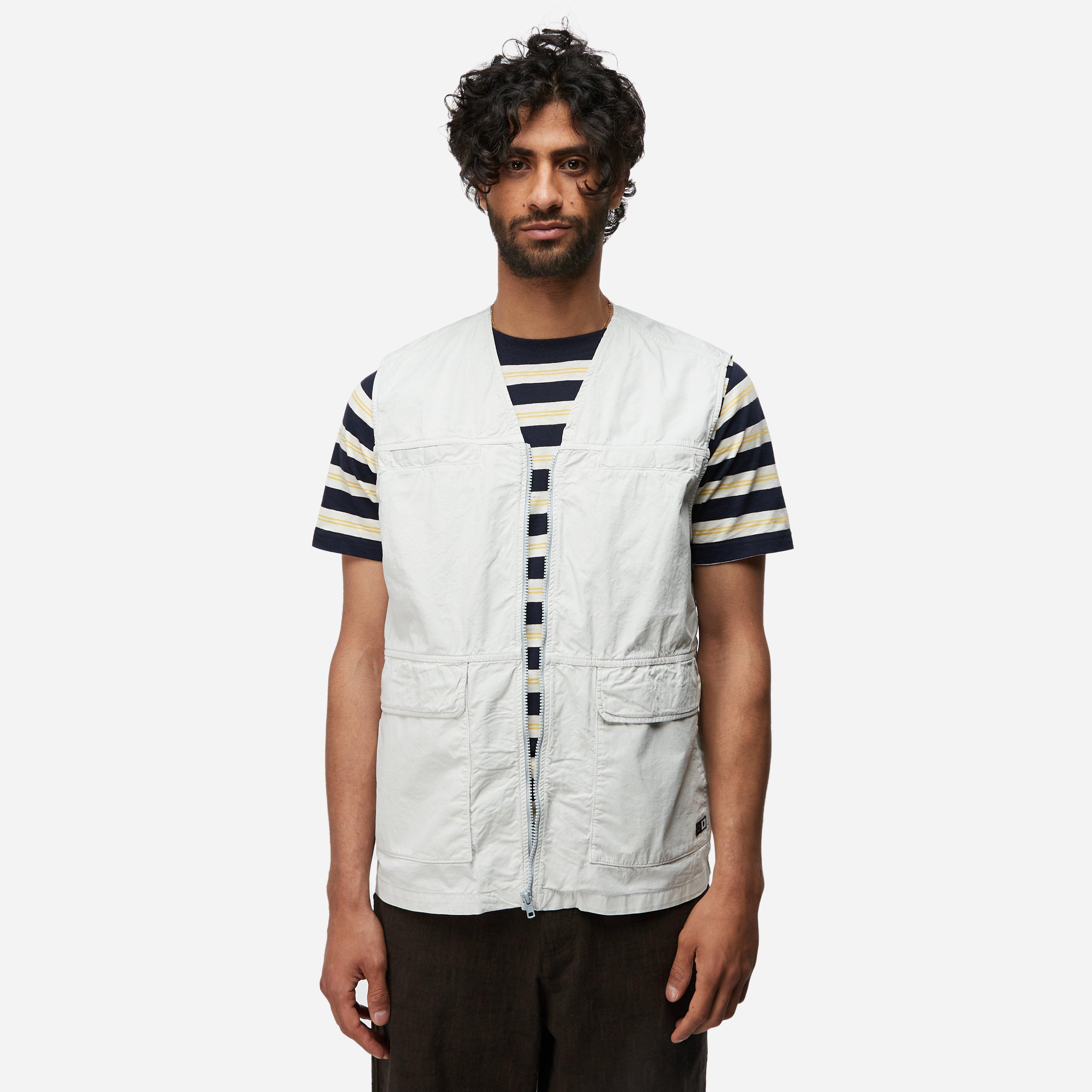 Edwin's Merten Vest is a wearable utility vest garment dyed in a neutral misty tone and made from eco-friendly fabric.