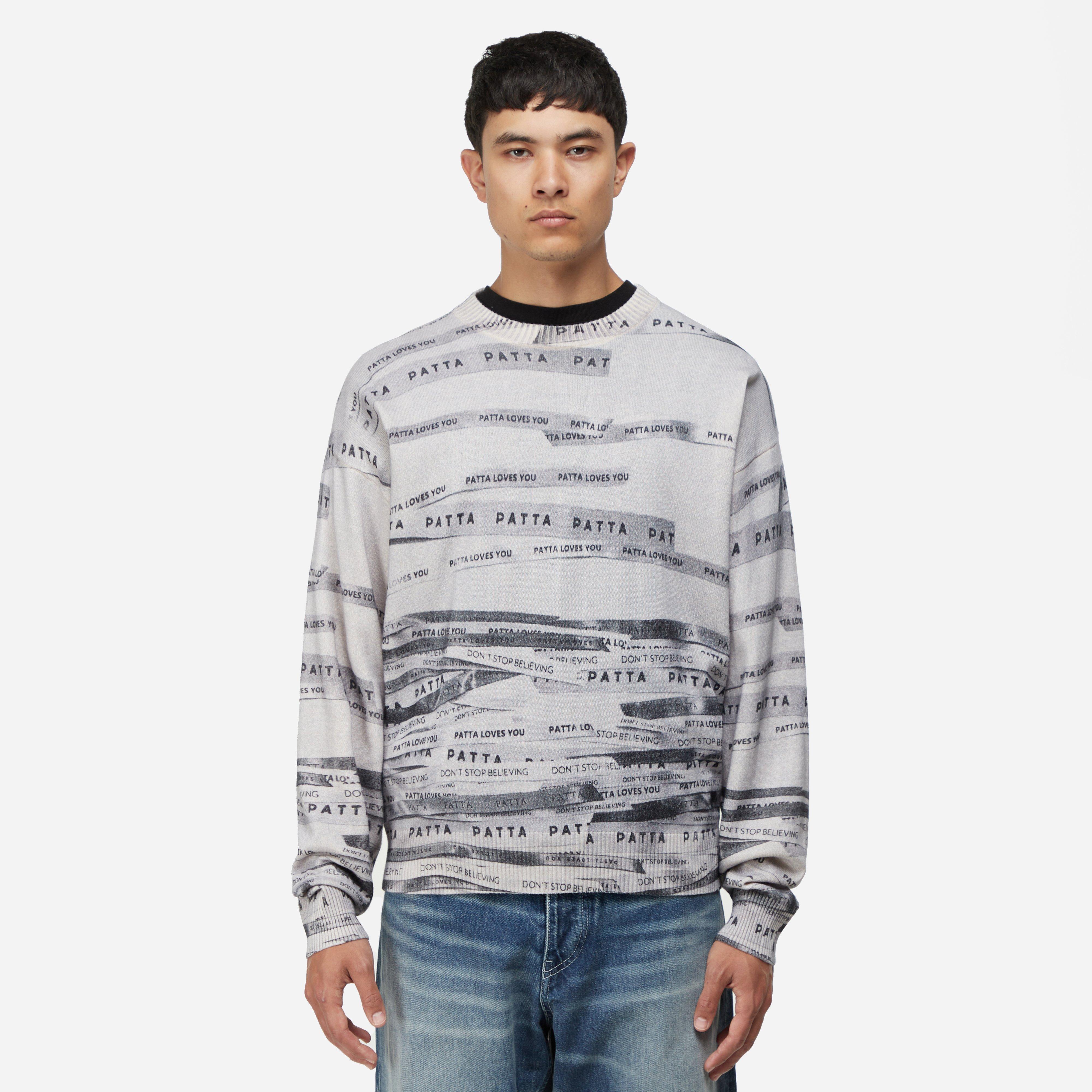 This Sweat is knitted from fine cotton and decorated with a bold, all-over ribbons motif for a unique finish. Grey - 100% cotton - Ribbed trims - Printed artwork - Regular fit, take your normal size - Model is 6'1'' and wears a size medium.
